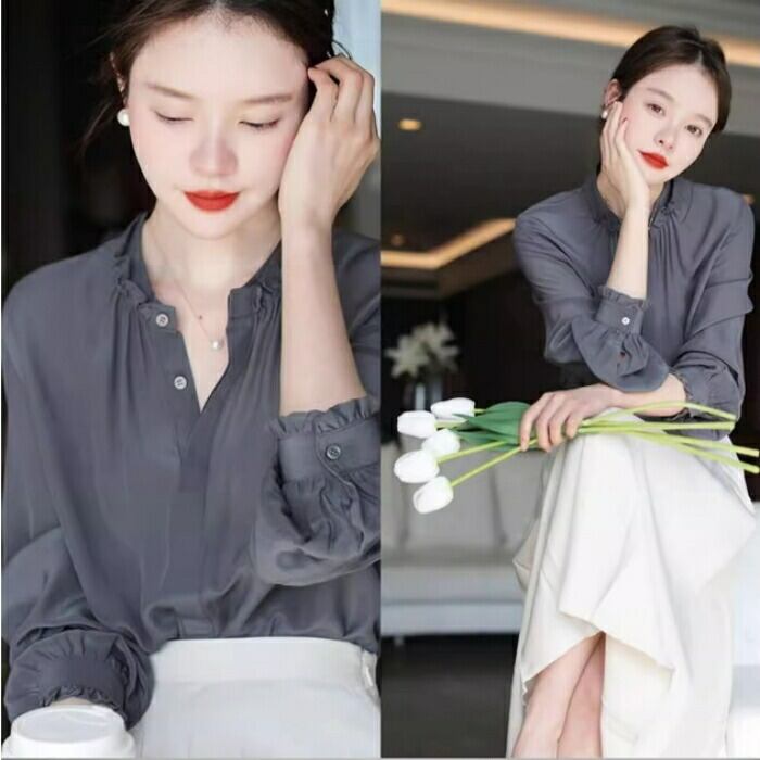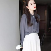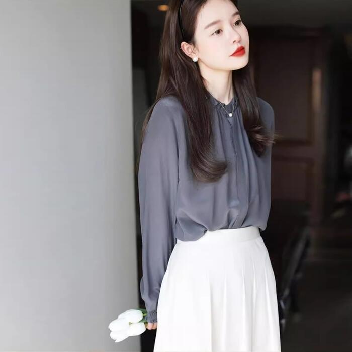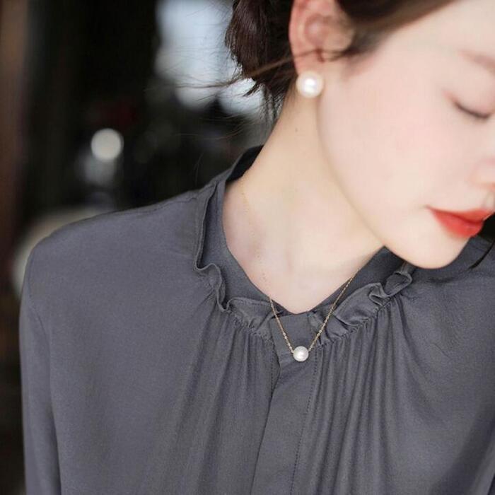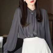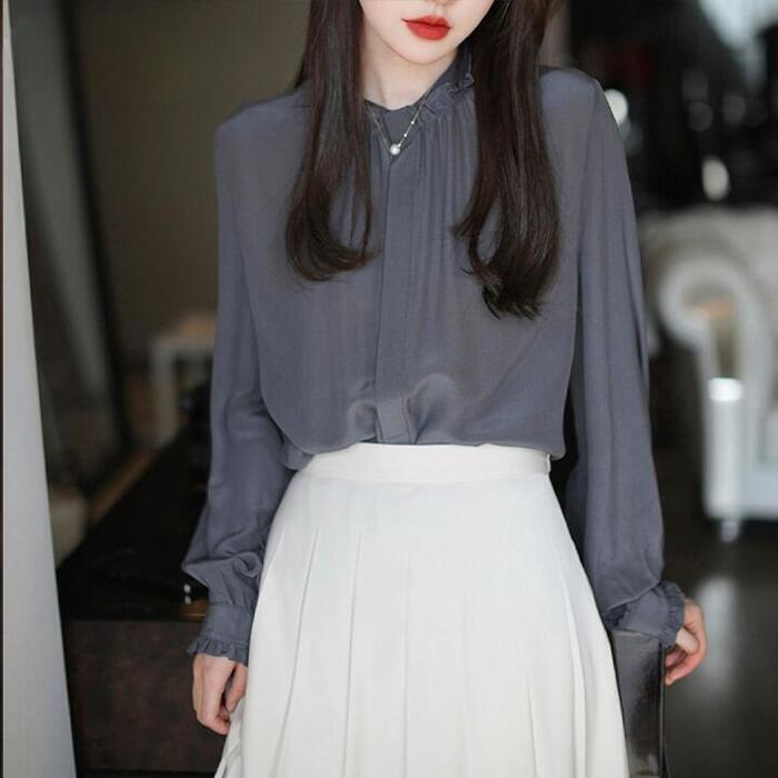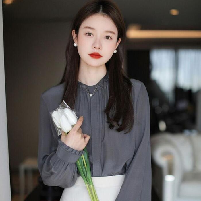 大きいサイズ トップス シャツ ブラウス フリル 比翼 フライフロント レディース エレガント 大人 可愛い きれいめ カジュアル フェミニン 長袖 シンプル お呼ばれ 上品 体型カバー 羽織り ナチュラル 通勤 オフィス グレー 春 秋 夏 20代 30代 40代 50代