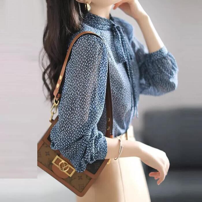 大きいサイズ 透け感 トップス シャツ ブラウス ボウタイ リボン プリント 幾何柄 ボタニカル レディース エレガント 大人 可愛い きれいめ カジュアル フェミニン 長袖 レトロ クラシカル 体型カバー ナチュラル 通勤 オフィス 青 ブルー 春 秋 夏 20代 30代 40代 50代