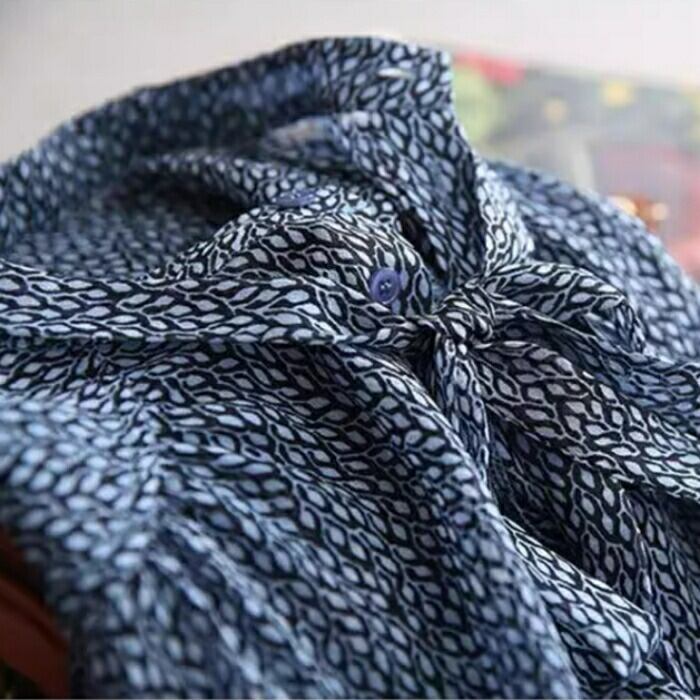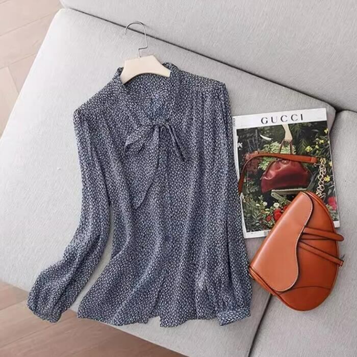 レトロ柄が華やかなボウタイブラウス。