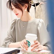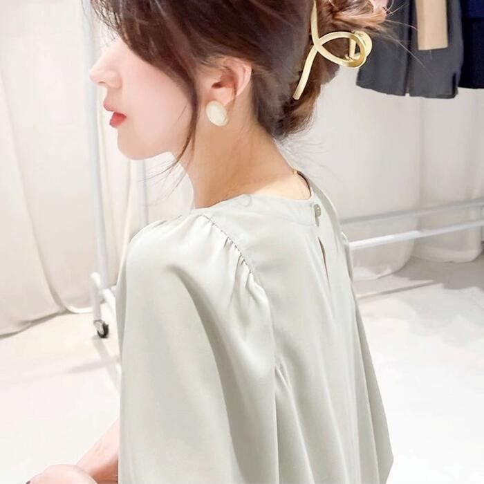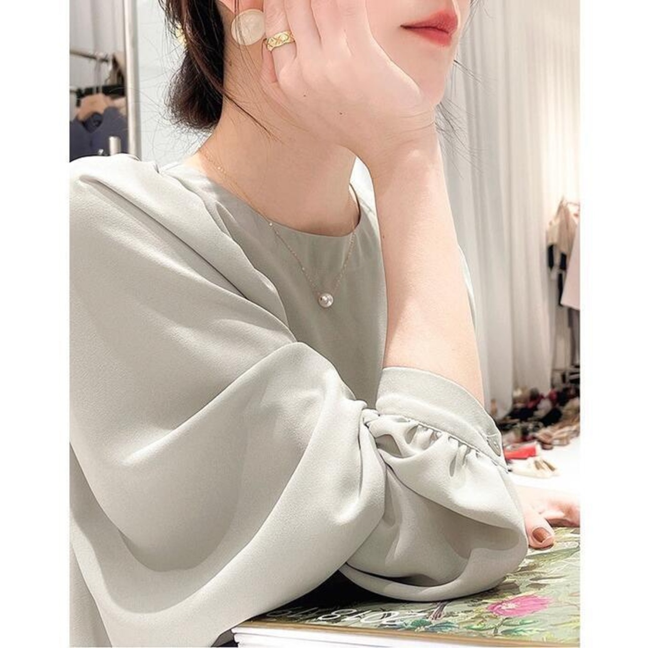 肩にギャザーを入れたふんわりとしたシルエットが、女性らしい印象。