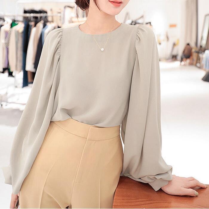 大きいサイズ ナチュラル クラシカル パフスリーブ トップス シャツ ブラウス Tシャツ プルオーバー レディース エレガント 大人 可愛い きれいめ カジュアル フェミニン 長袖 シンプル 上品 無地 体型カバー 通勤 オフィス お呼ばれ グレー 春 秋 冬 20代 30代 40代 50代