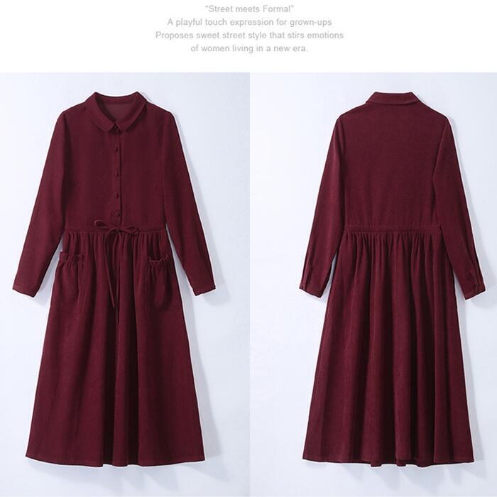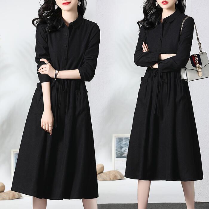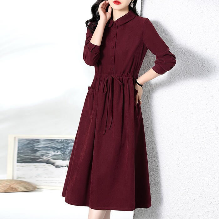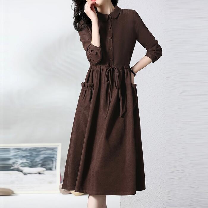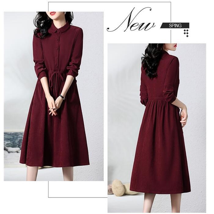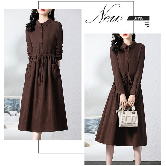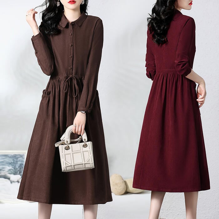 全3色 大きいサイズ 体型カバー ワンピース ワンピ ドレス 袖あり シャツワンピース 無地 襟付き レディース エレガント きれいめ カジュアル 長袖 大人 可愛い フェミニン ミモレ丈 Aライン ハイウエスト ドロスト レッド 赤 ブラウン ブラック 黒 春 秋 冬 20代 30代 40代 50代