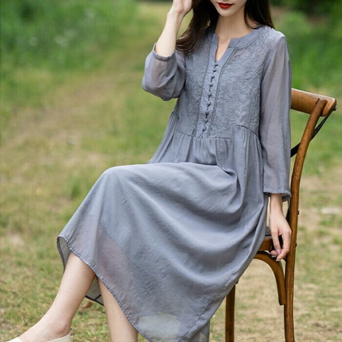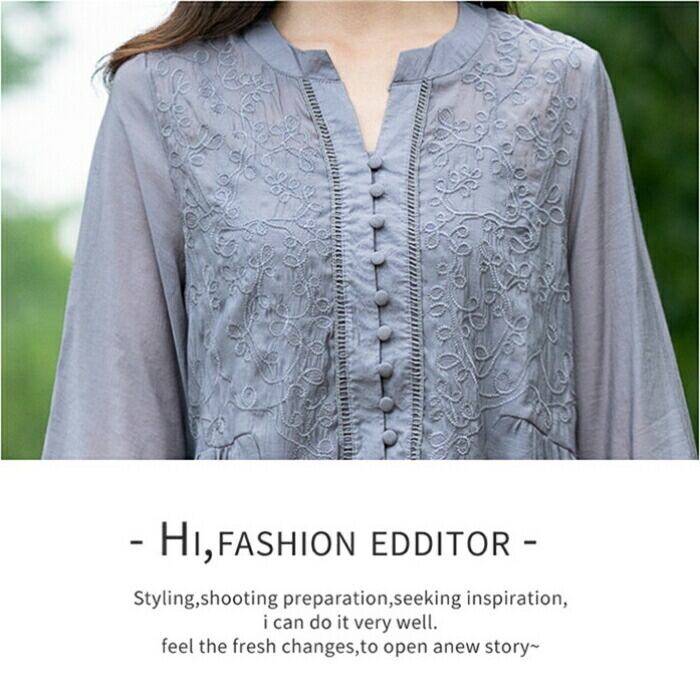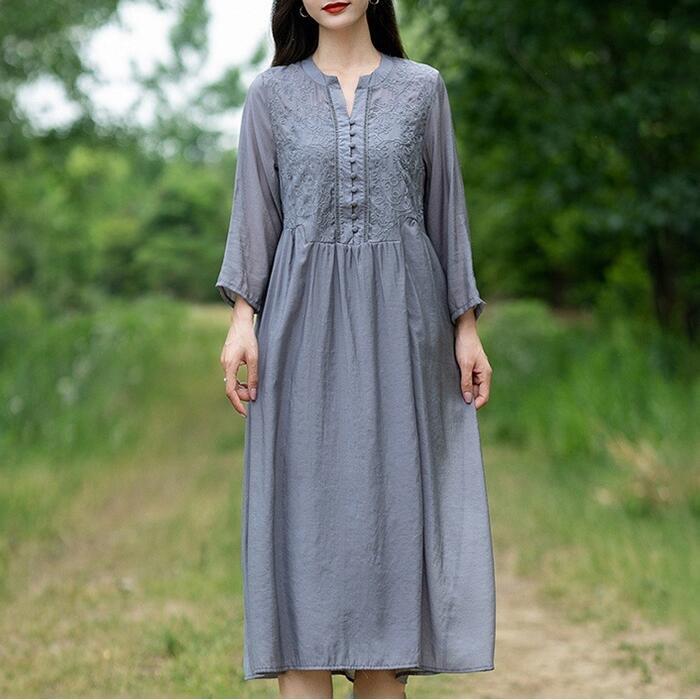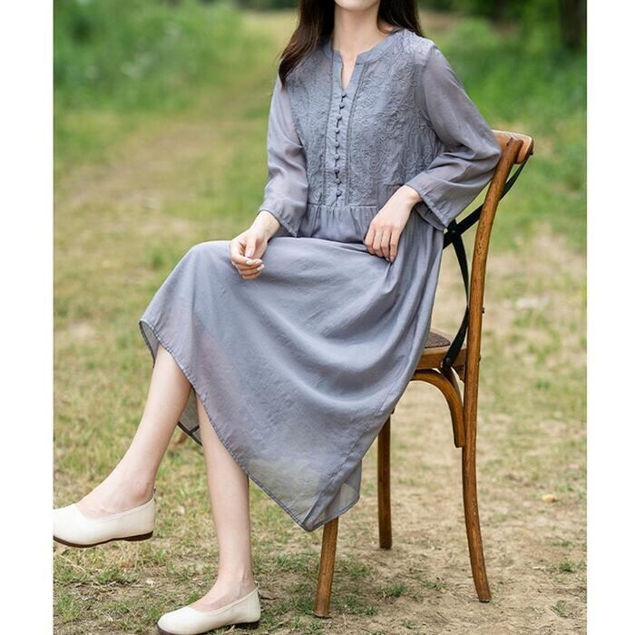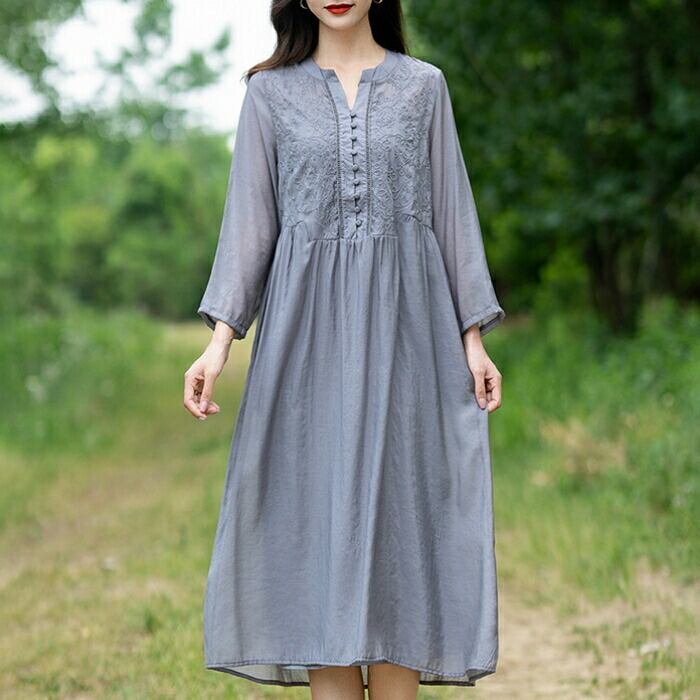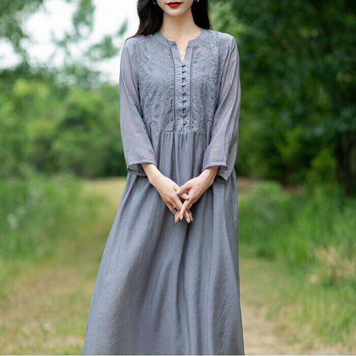 大きいサイズ 体型カバー ワンピース ワンピ ドレス 袖あり シャツワンピース 刺繍 レディース エレガント きれいめ カジュアル 七分袖 長袖 大人 可愛い フェミニン ミモレ丈 Aライン ゆったり ナチュラル 楽ちん グレー 春 秋 夏 20代 30代 40代 50代