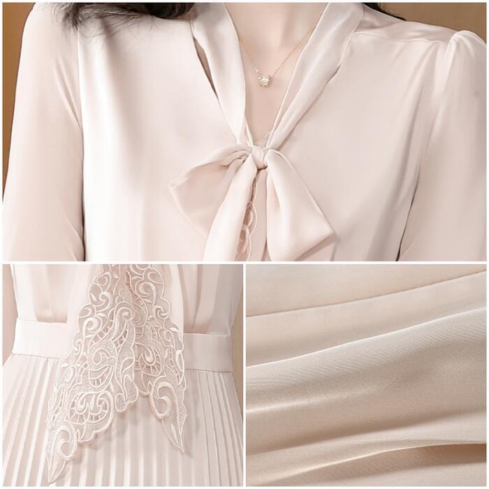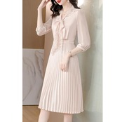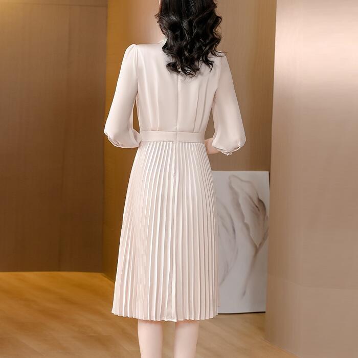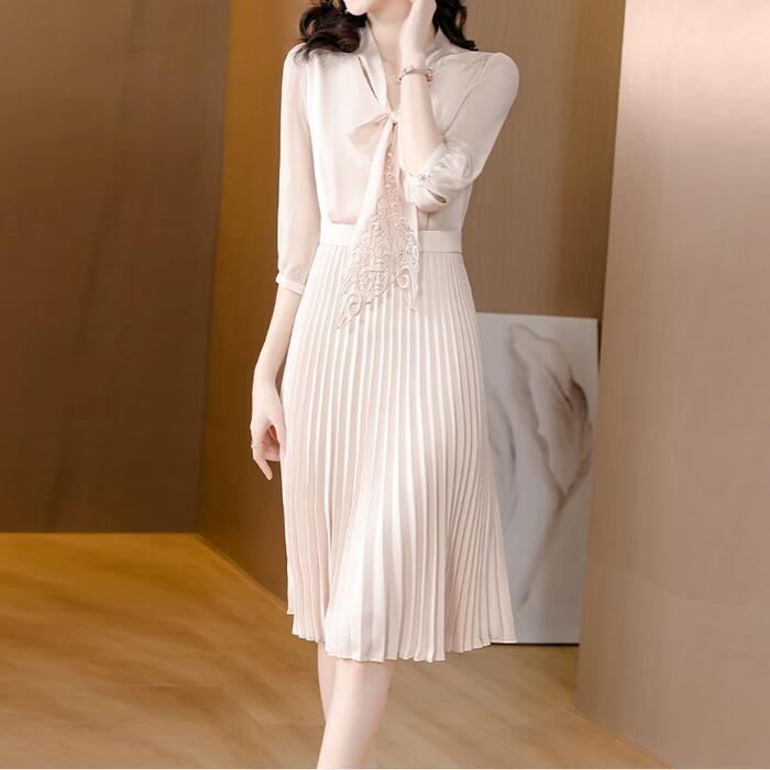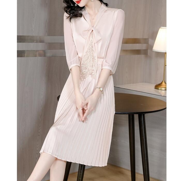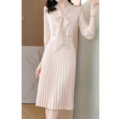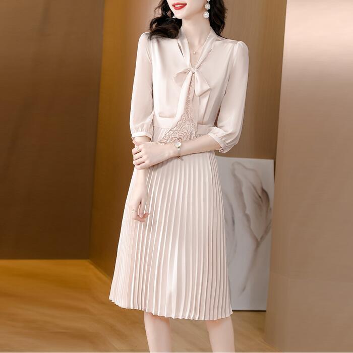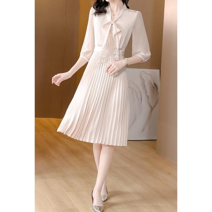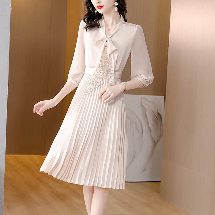 大きいサイズ 体型カバー ワンピース ワンピ ドレス 袖あり ボウタイ リボンタイ レース プリーツ レディース エレガント きれいめ カジュアル 七分袖 大人 可愛い フェミニン ミモレ丈 Aライン 上品 お呼ばれ オケージョン ナチュラル ベージュ 春 秋 夏 20代 30代 40代 50代
