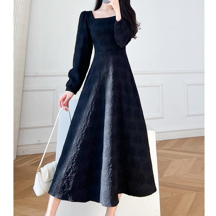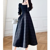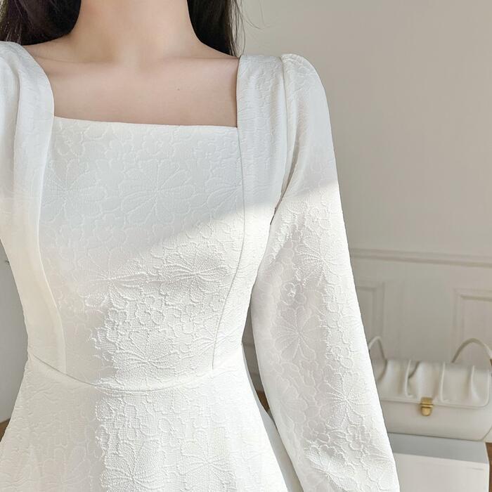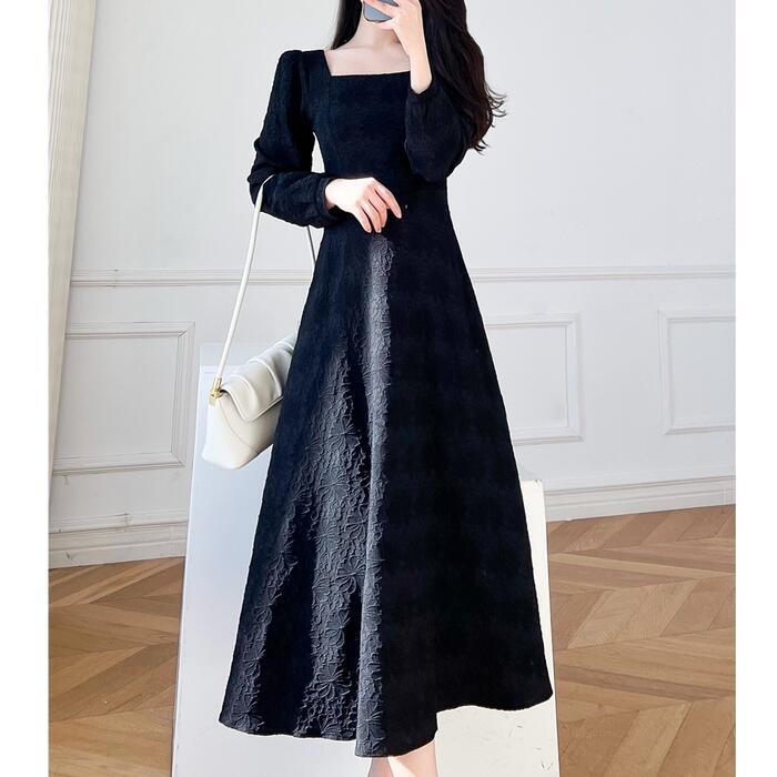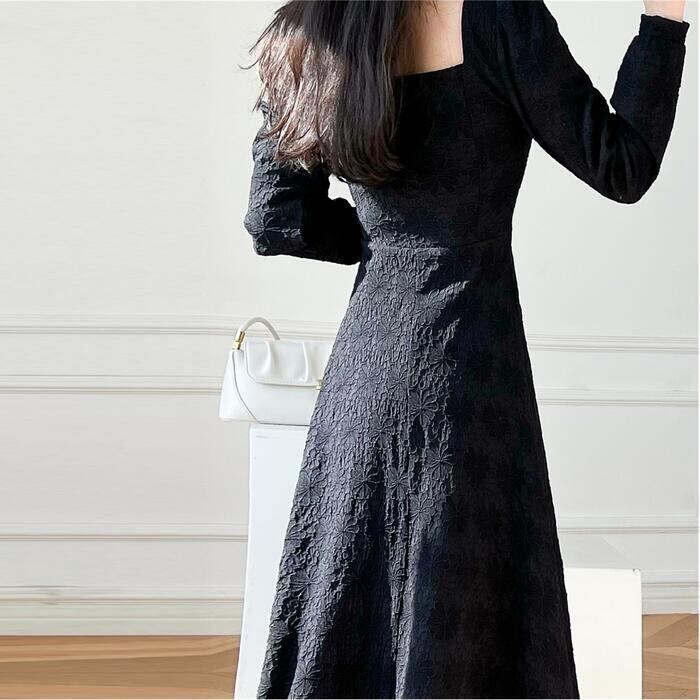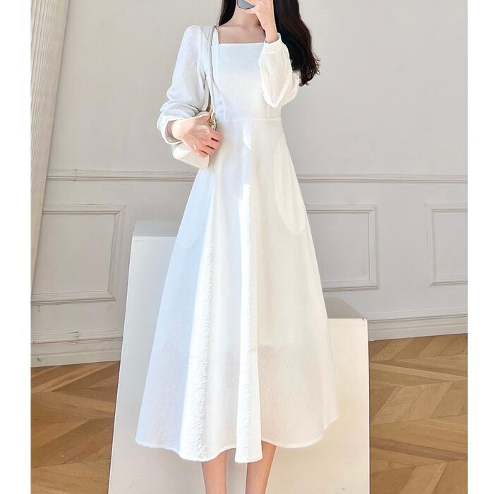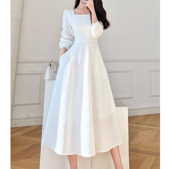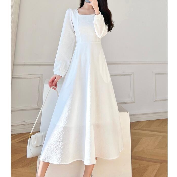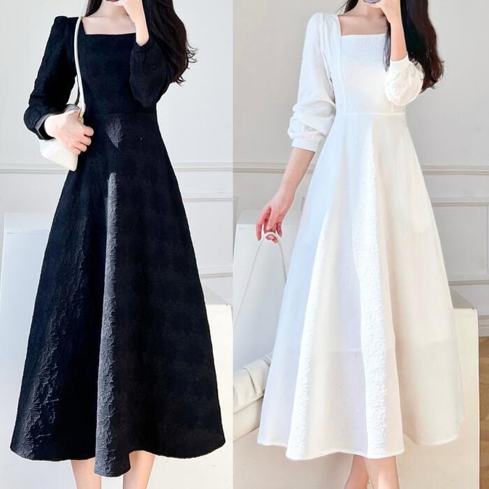 全2色 大きいサイズ 体型カバー Aライン お呼ばれ ワンピース ワンピ ドレス 袖あり 切り替え 花柄 フラワー レディース エレガント きれいめ カジュアル 長袖 大人 可愛い フェミニン ミモレ丈 スクエアネック ナチュラル フォーマル ホワイト 白 ブラック 黒 春 秋 冬 20代 30代 40代 50代