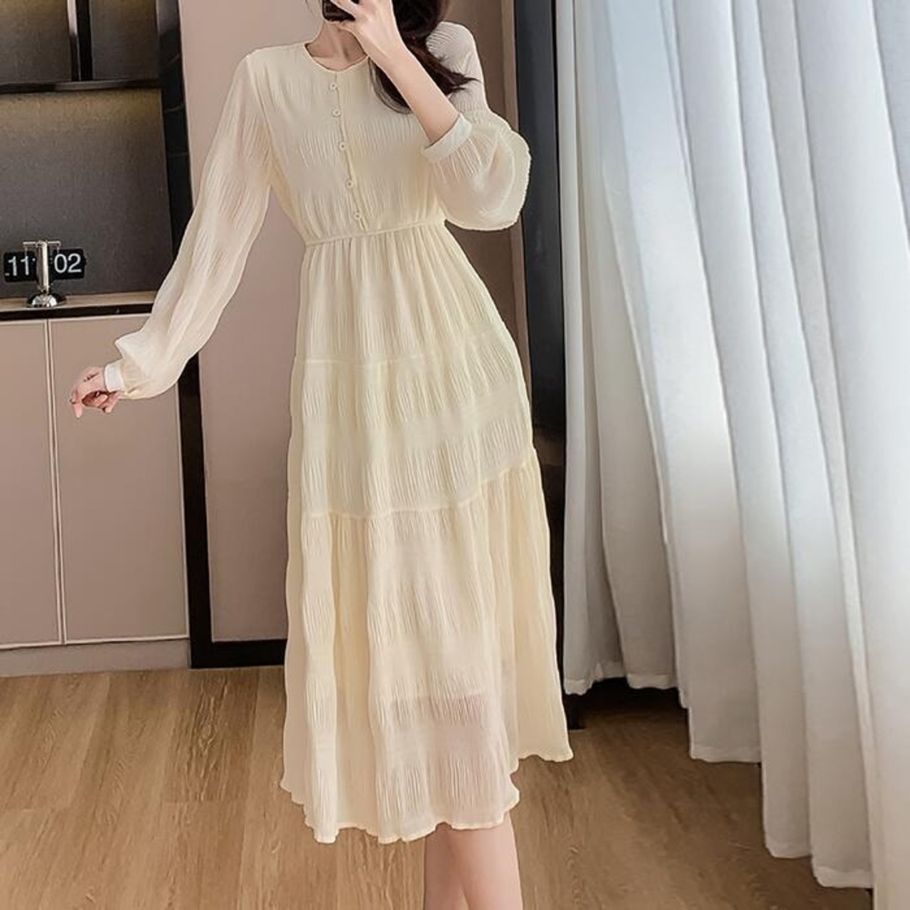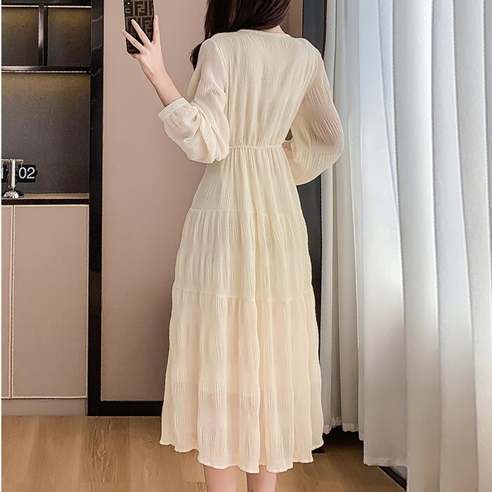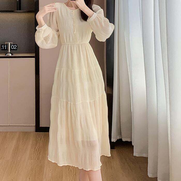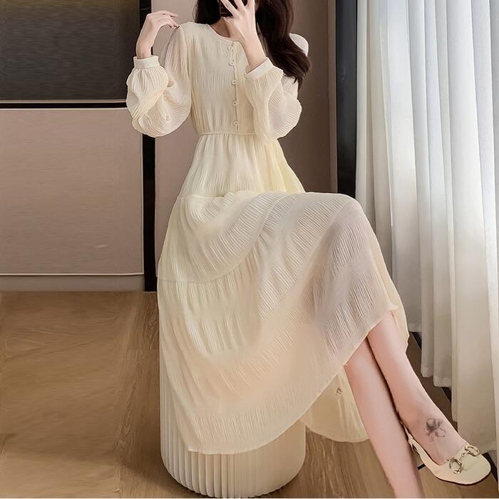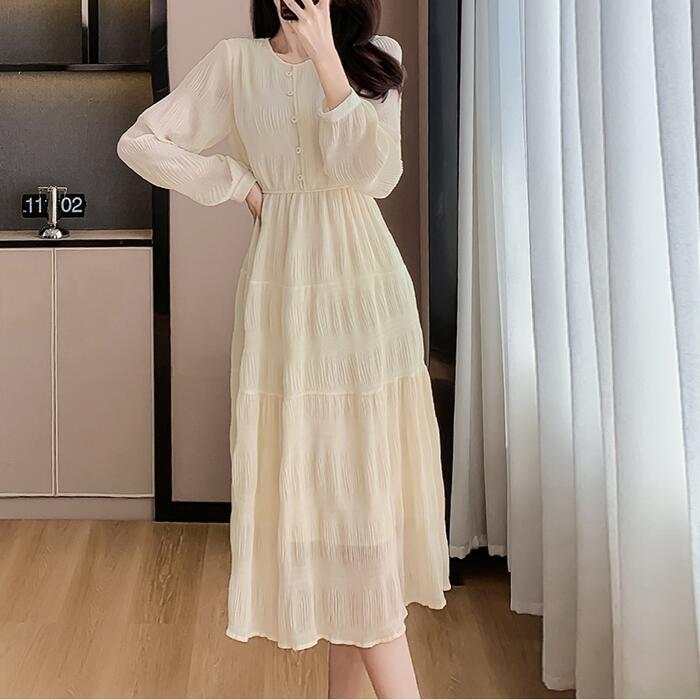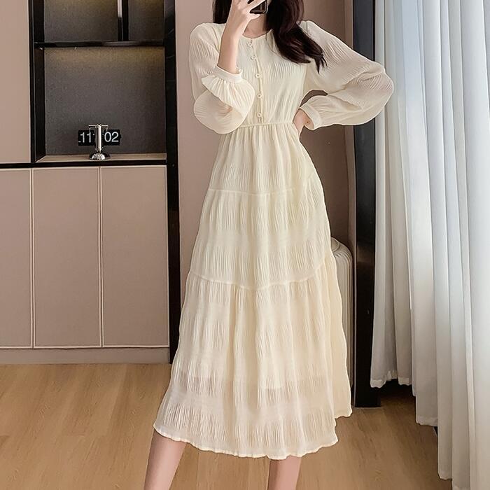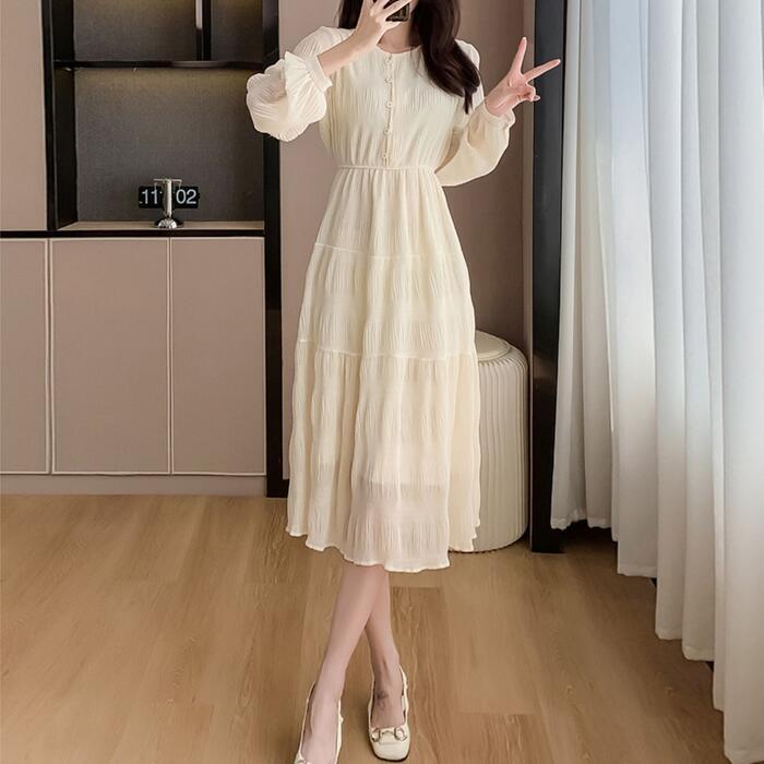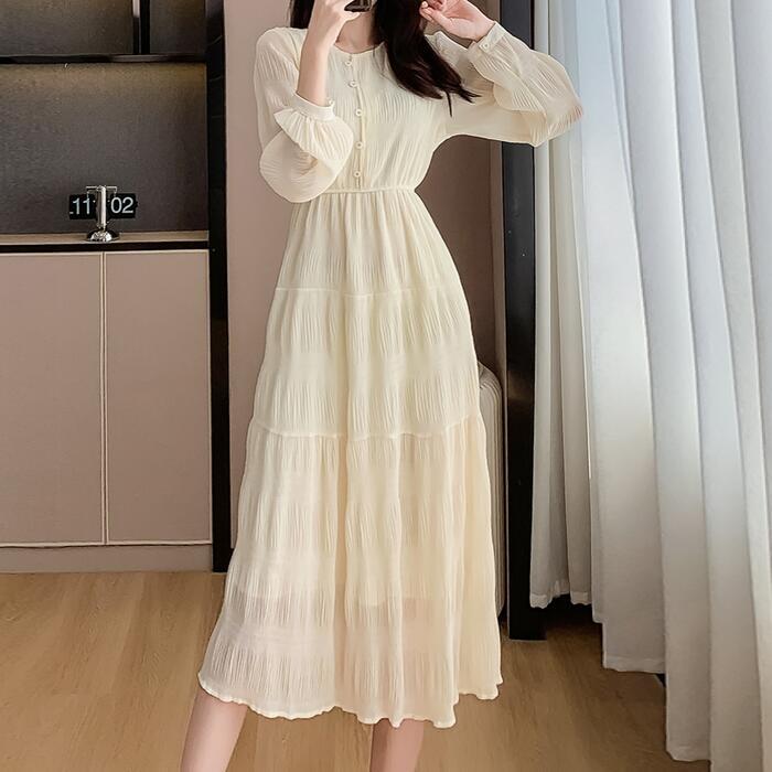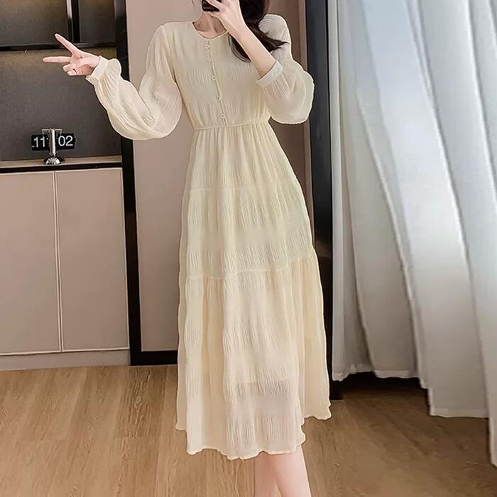大きいサイズ 体型カバー ティアード ワンピース ワンピ ドレス 袖あり 切り替え シワ加工 シフォン レディース エレガント きれいめ カジュアル 長袖 大人 可愛い フェミニン ミモレ丈 ナチュラル 透け感 Aライン ベージュ 春 秋 冬 20代 30代 40代 50代