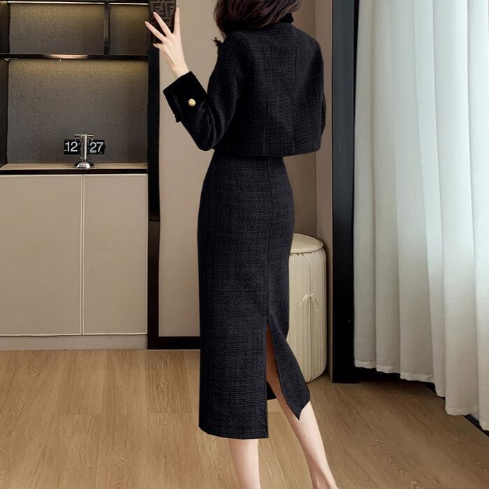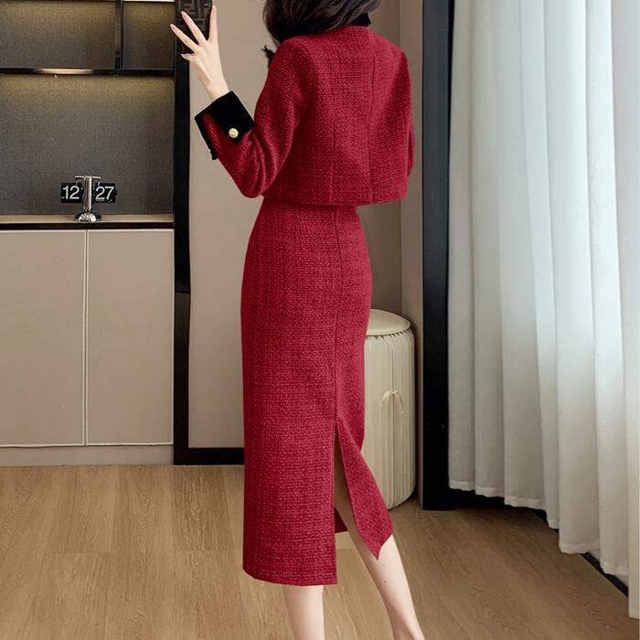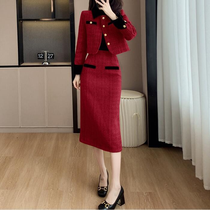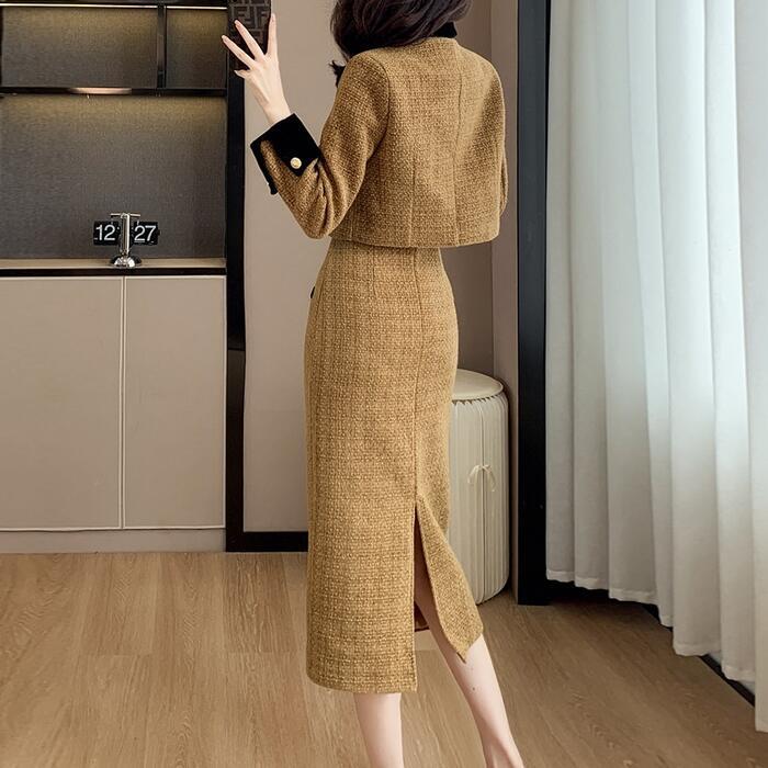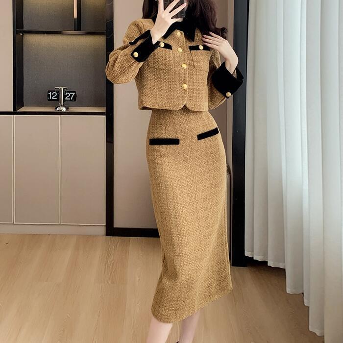 中綿入りで暖かな、ジャケット&スカートのツイードセットアップ。