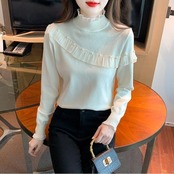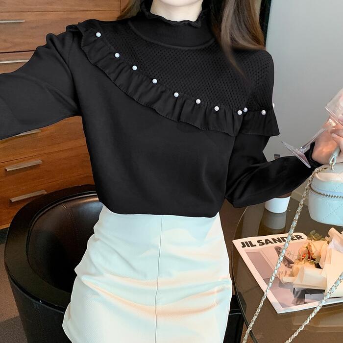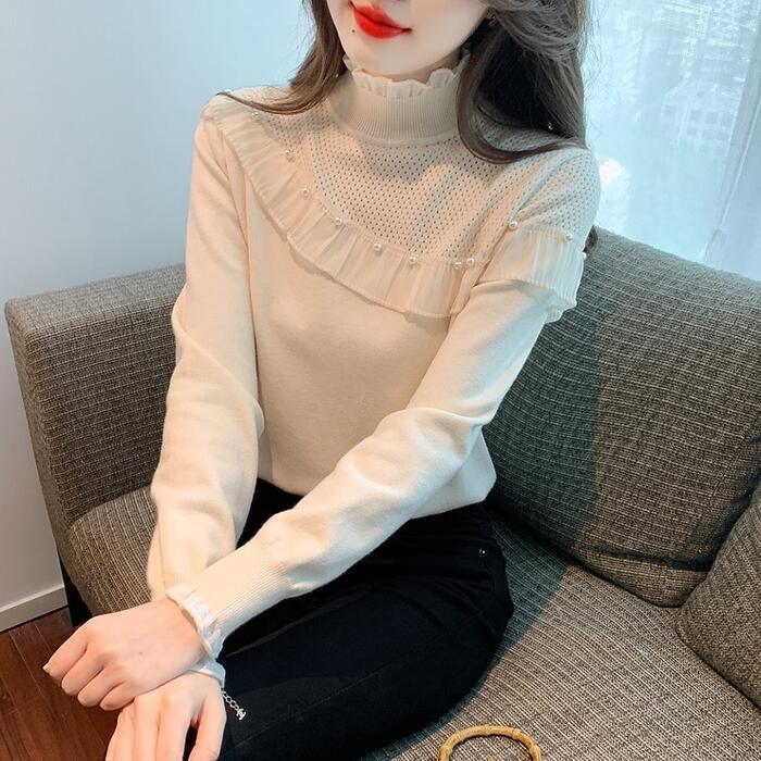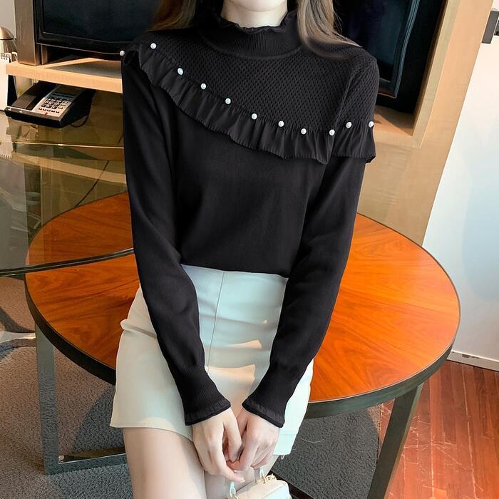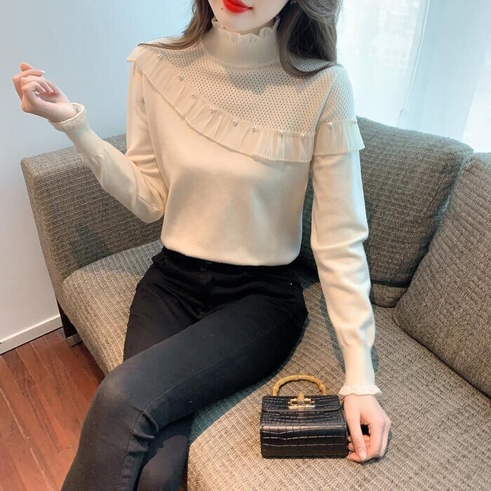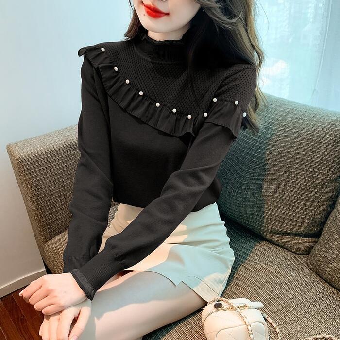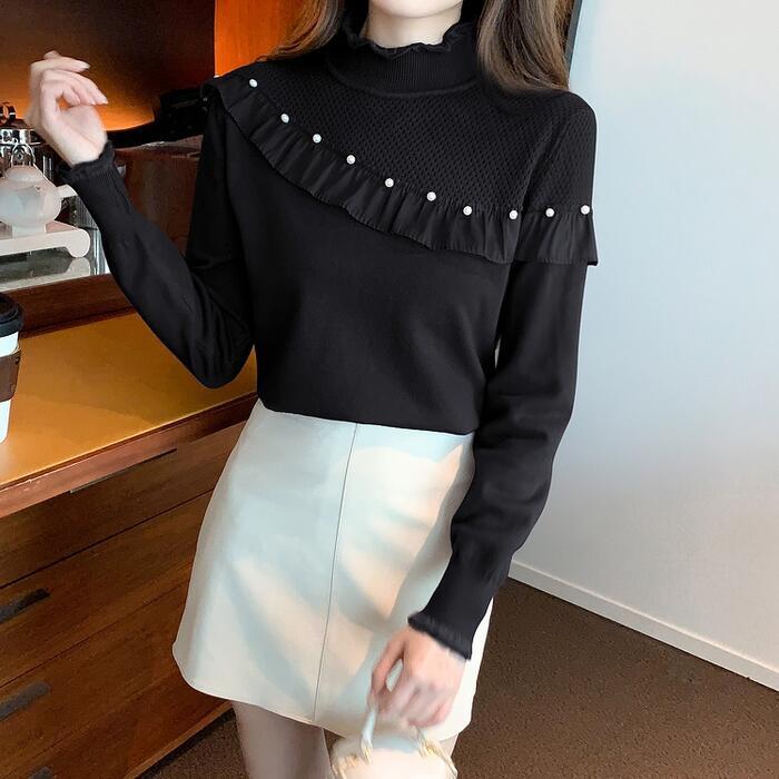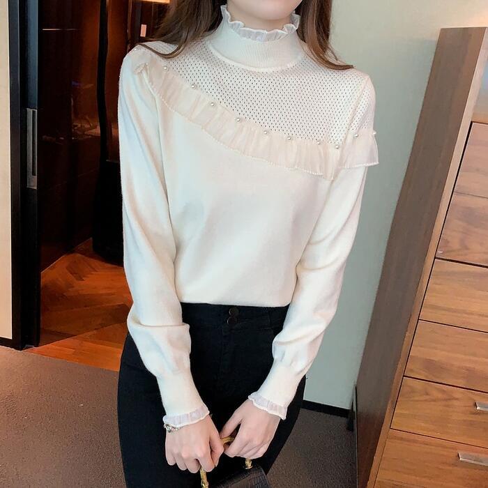 フリルやパールで甘さをプラスしたタートルニット。