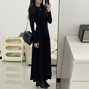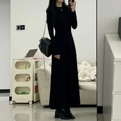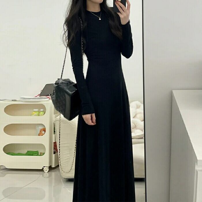 大きいサイズ 体型カバー ワンピース ワンピ ドレス 袖あり ストレッチ レディース エレガント きれいめ カジュアル 長袖 大人 可愛い フェミニン ロング丈 シンプル Aライン フレア ハイウエスト 無地 ベーシック ブラック 黒 春 秋 冬 20代 30代 40代 50代