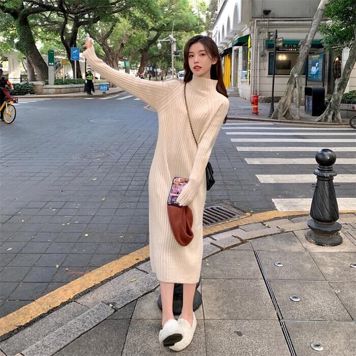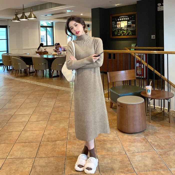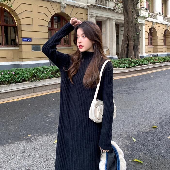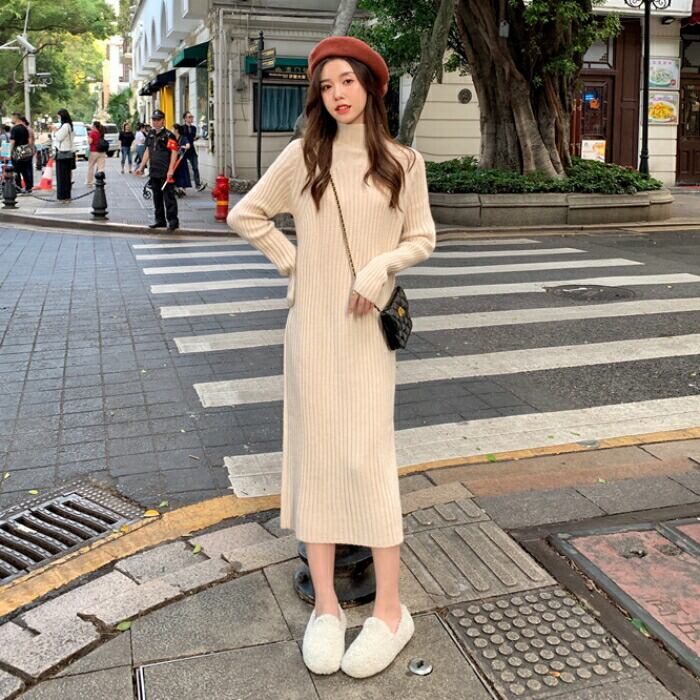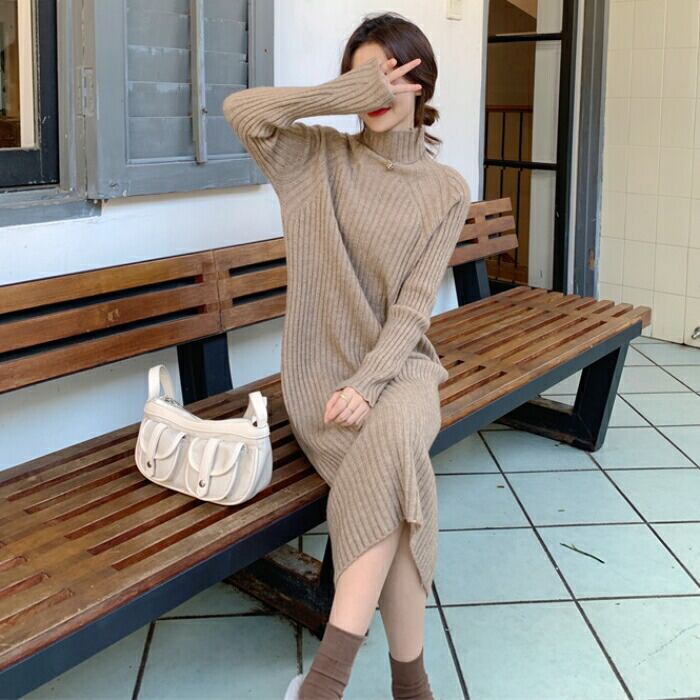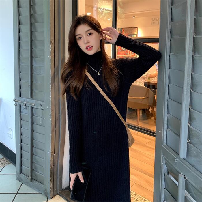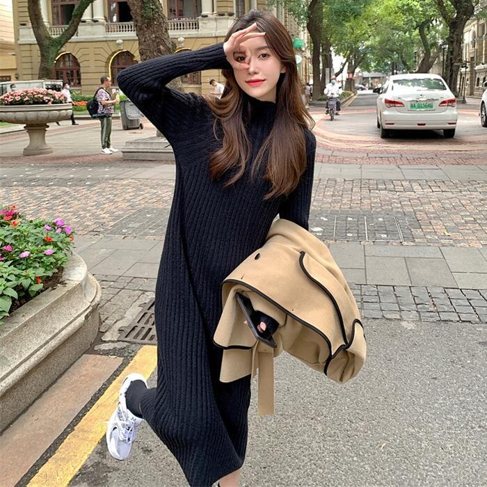 全3色 大きいサイズ 体型カバー ワンピース ニット ワンピ ドレス 袖あり タートルネック ハイネック リブ レディース エレガント きれいめ カジュアル 長袖 大人 可愛い フェミニン ミモレ丈 シンプル ゆったり ベーシック ブラウン ブラック 黒 春 秋 冬 20代 30代 40代 50代