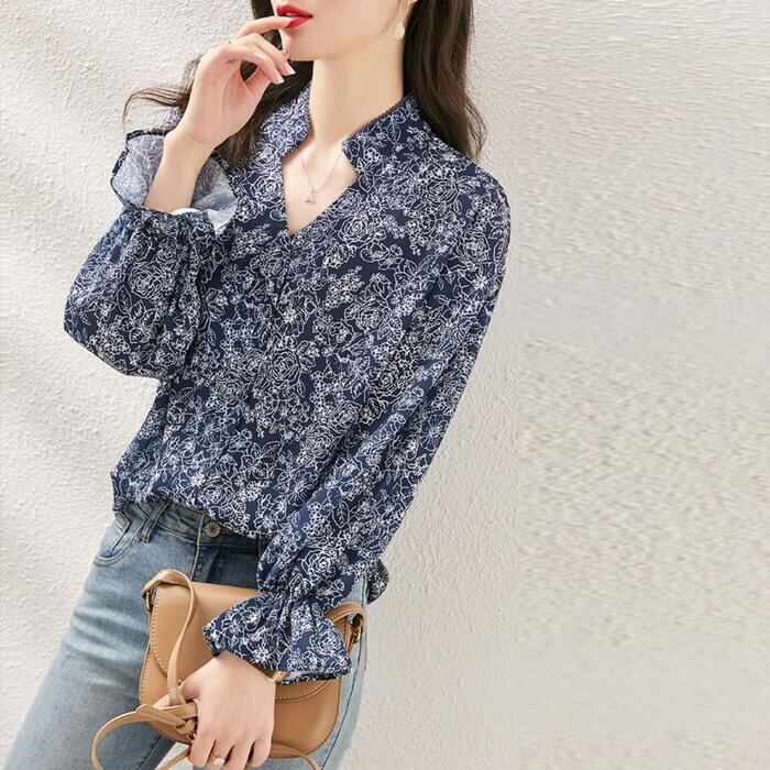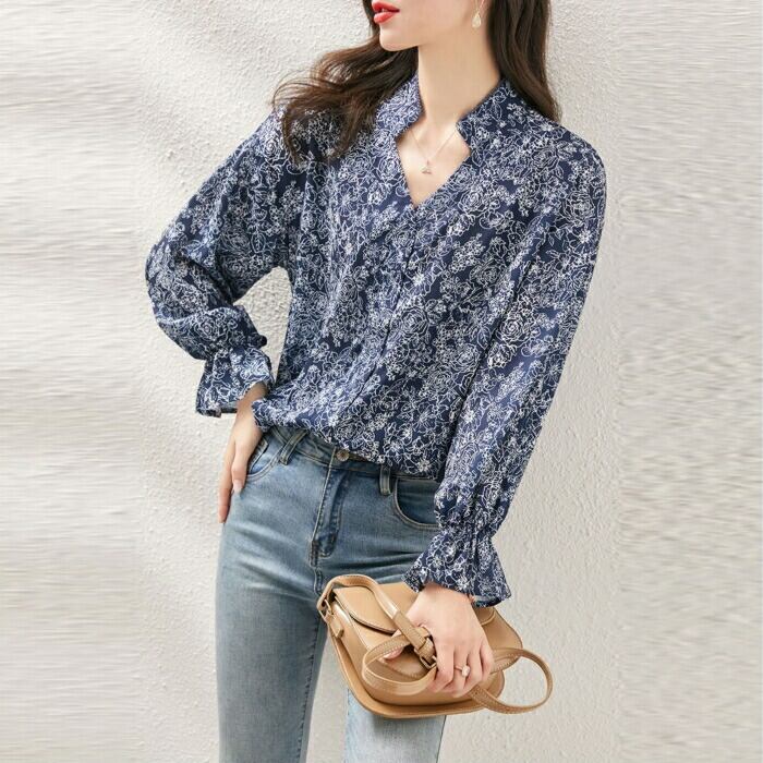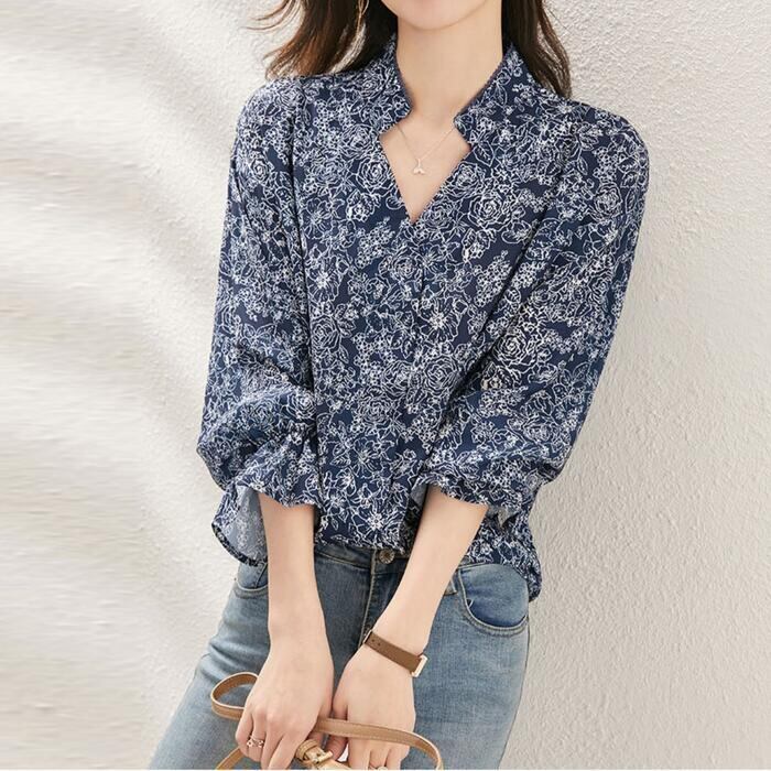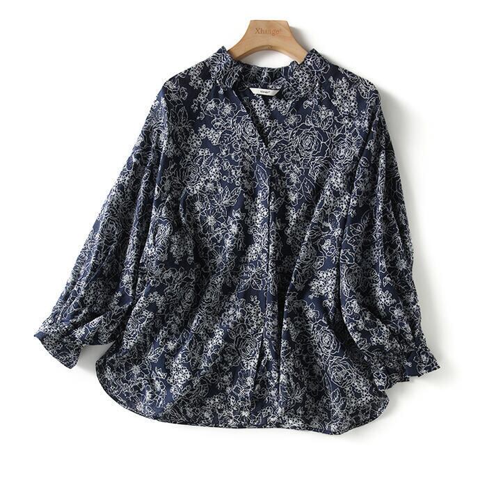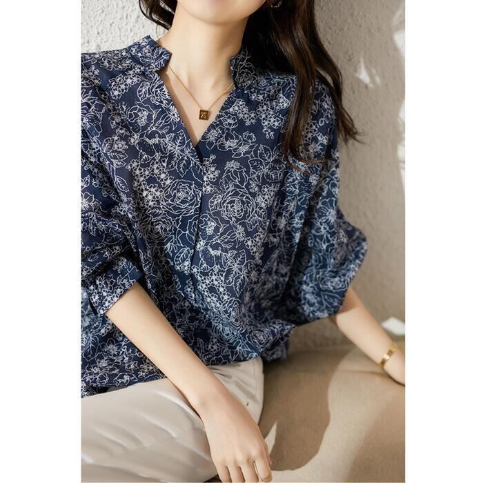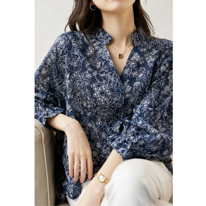 大きいサイズ 体型カバー トップス フラワー ボタニカル プリント シャツ ブラウス プルオーバー レディース エレガント 大人 可愛い きれいめ カジュアル フェミニン 長袖 ナチュラル Vネック ゆったり 青 ブルー 春 秋 冬 20代 30代 40代 50代