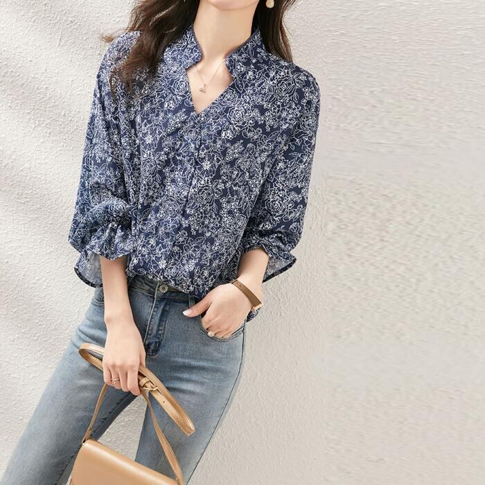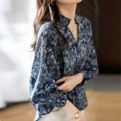 落ち着いたシックなフラワープリントのブラウス。