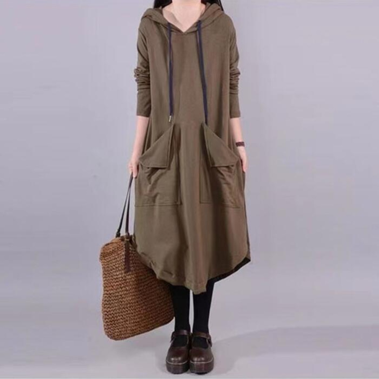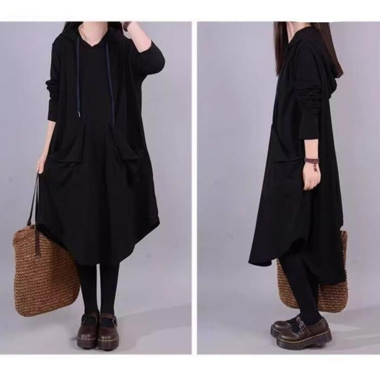 全2色 大きいサイズ 体型カバー ワンピース ワンピ ドレス 袖あり フード パーカー プルオーバー レディース きれいめ カジュアル 長袖 大人 可愛い フェミニン ミモレ丈 シンプル ゆったり リラックス 楽ちん ベージュ ブラック 黒 春 秋 冬 20代 30代 40代 50代