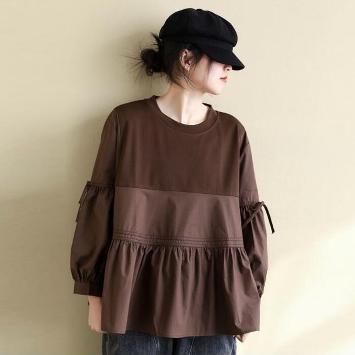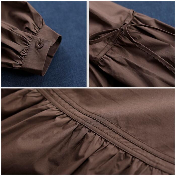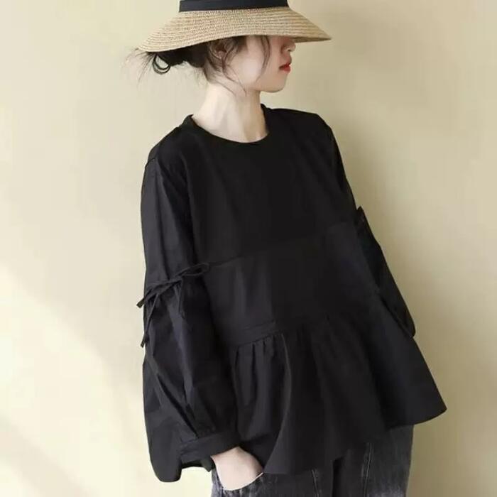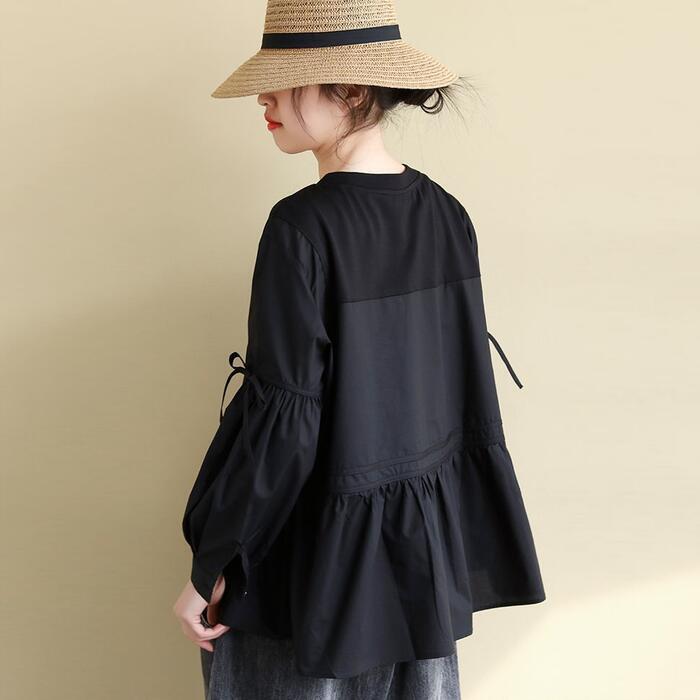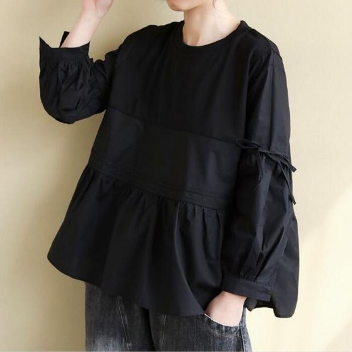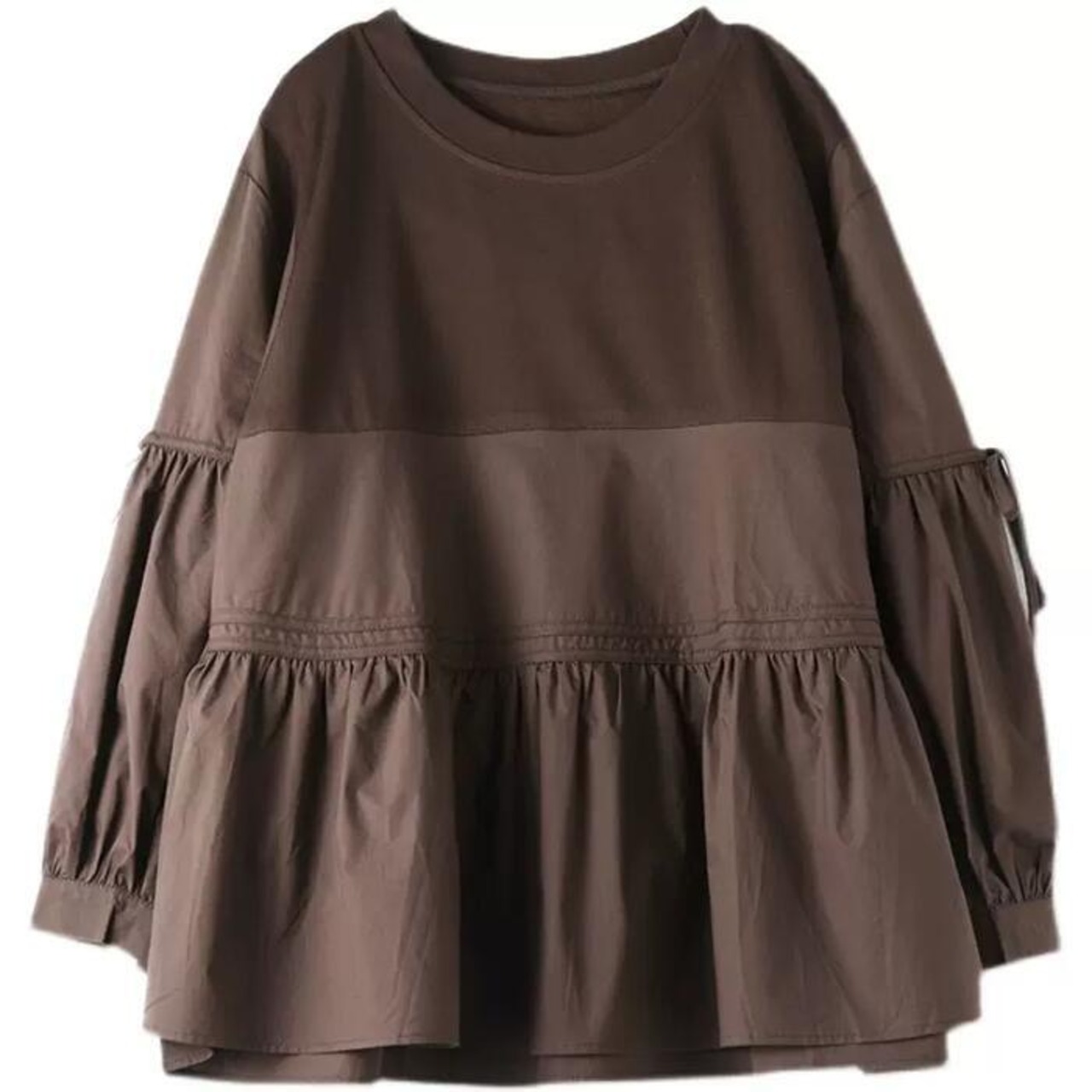 全2色 大きいサイズ パフスリーブ トップス シャツ ブラウス カットソー Tシャツ 切り替え リボン レディース エレガント 大人 可愛い きれいめ カジュアル フェミニン 長袖 シンプル 体型カバー ゆったり ブラウン ブラック 黒 春 秋 冬 20代 30代 40代 50代
