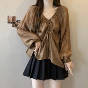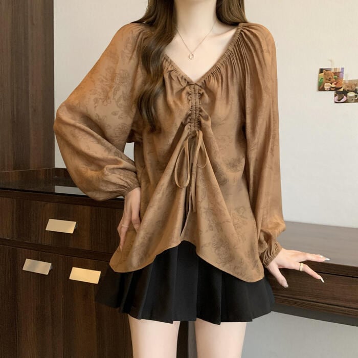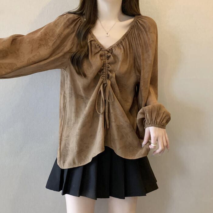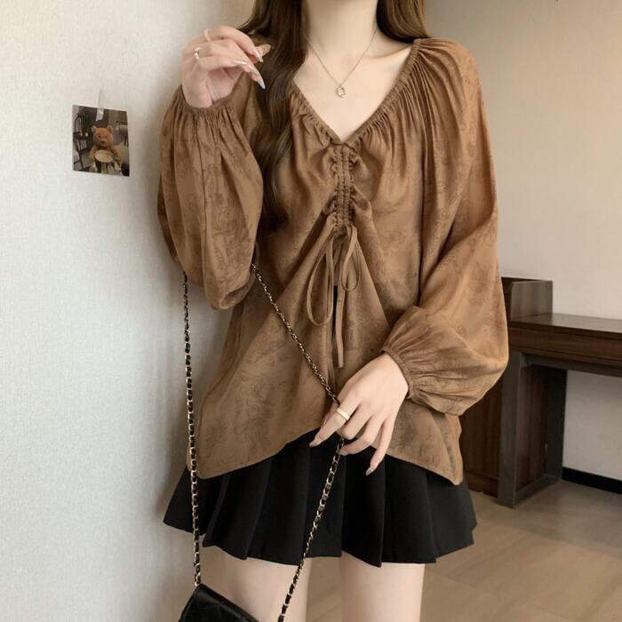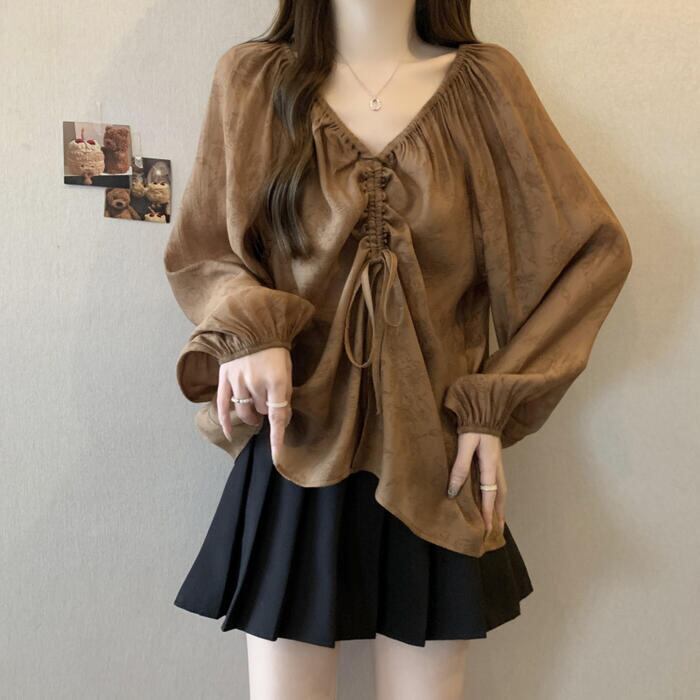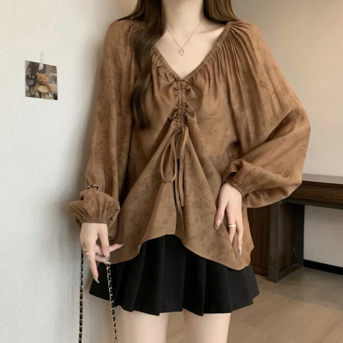 大きいサイズ トップス シャツ ブラウス Tシャツ カットソー リボン ギャザー パフスリーブ レディース エレガント 大人 可愛い きれいめ カジュアル フェミニン 長袖 ナチュラル Vネック 体型カバー ブラウン 春 秋 冬 20代 30代 40代 50代