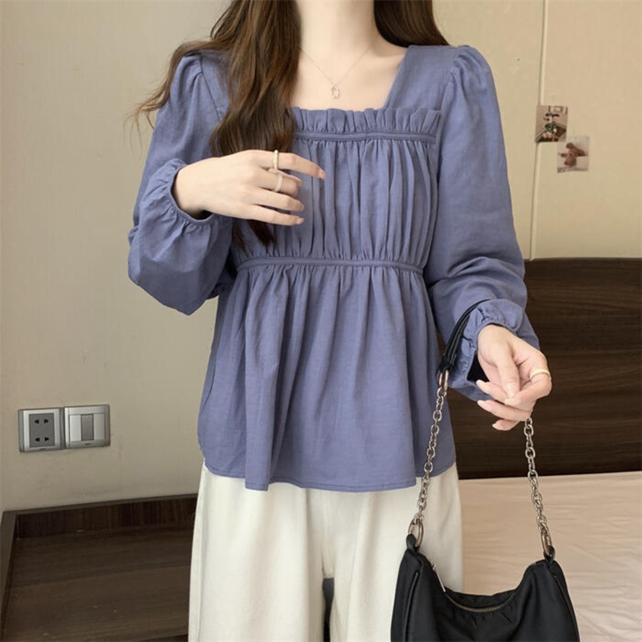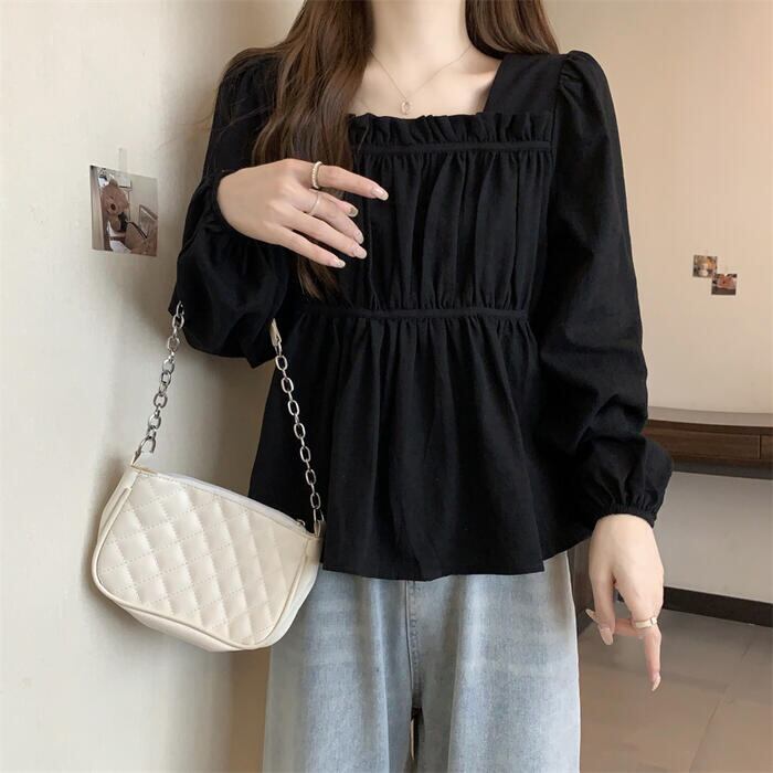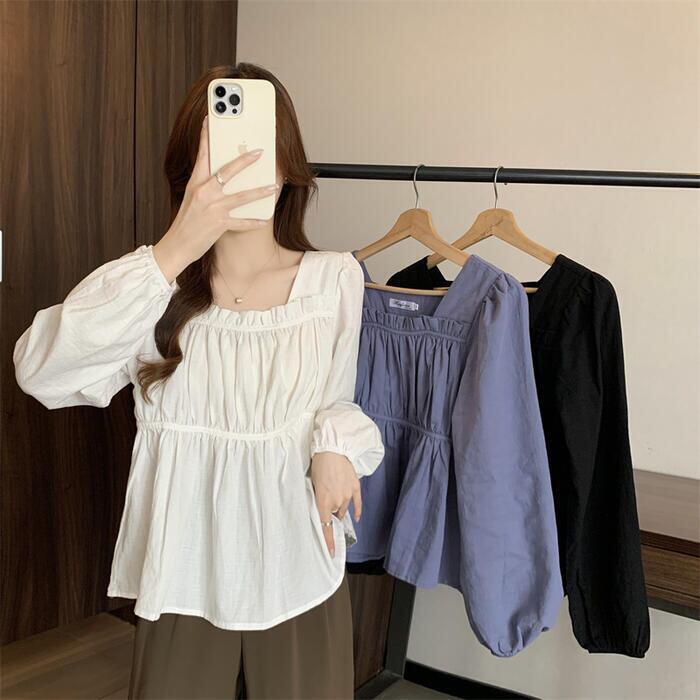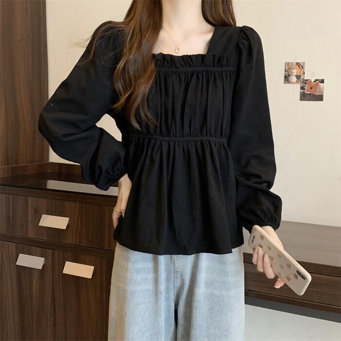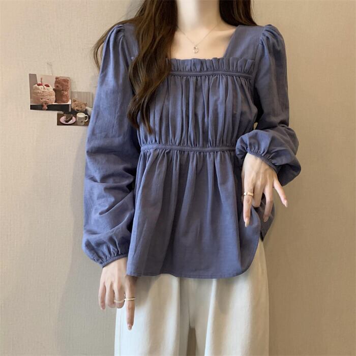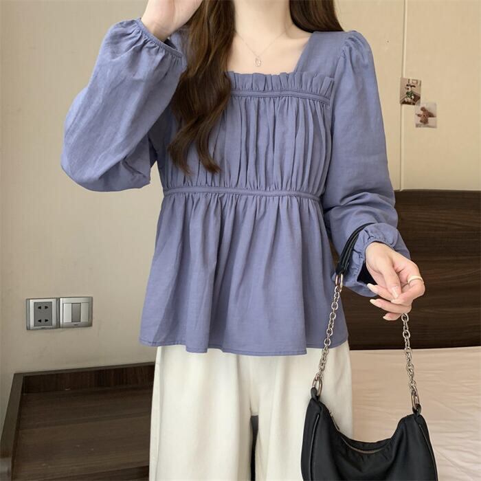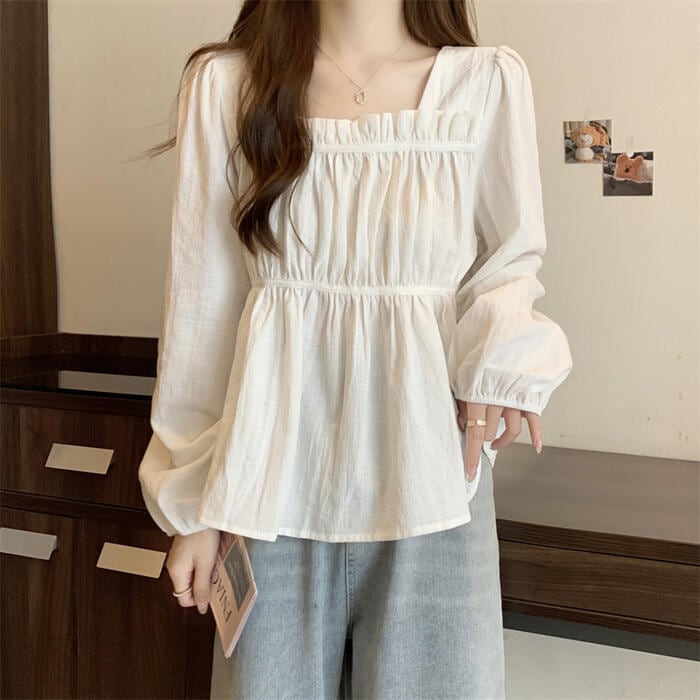 胸元にギャザーを寄せたスクエアネックのブラウス。