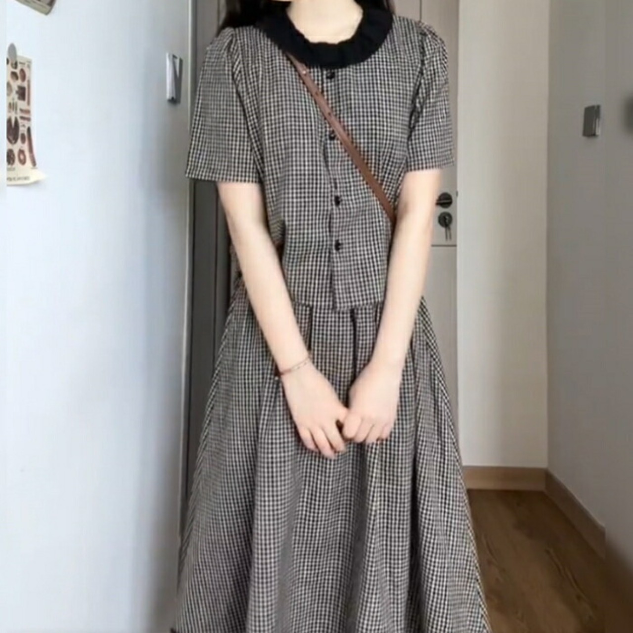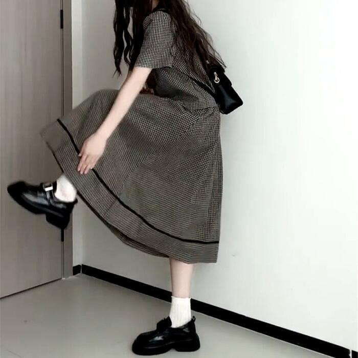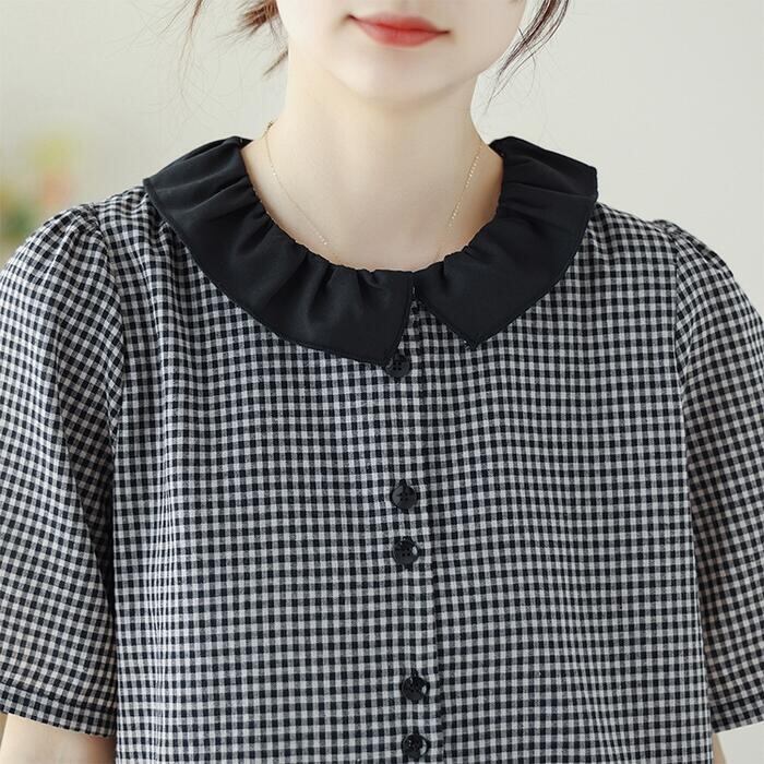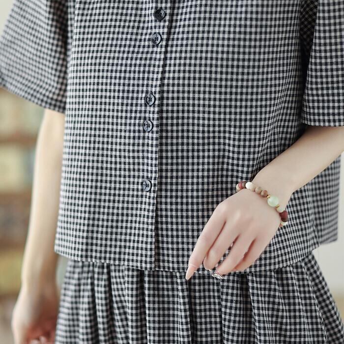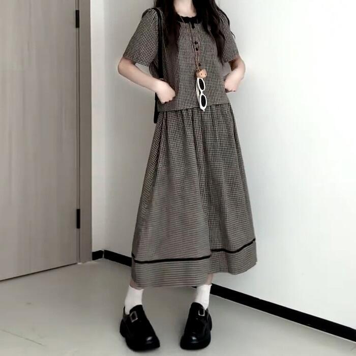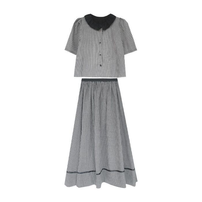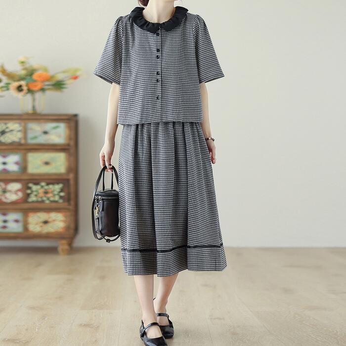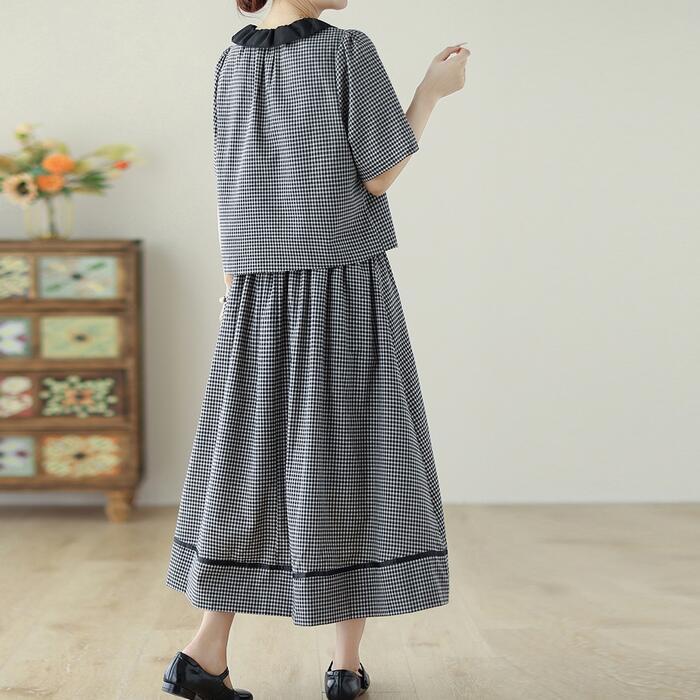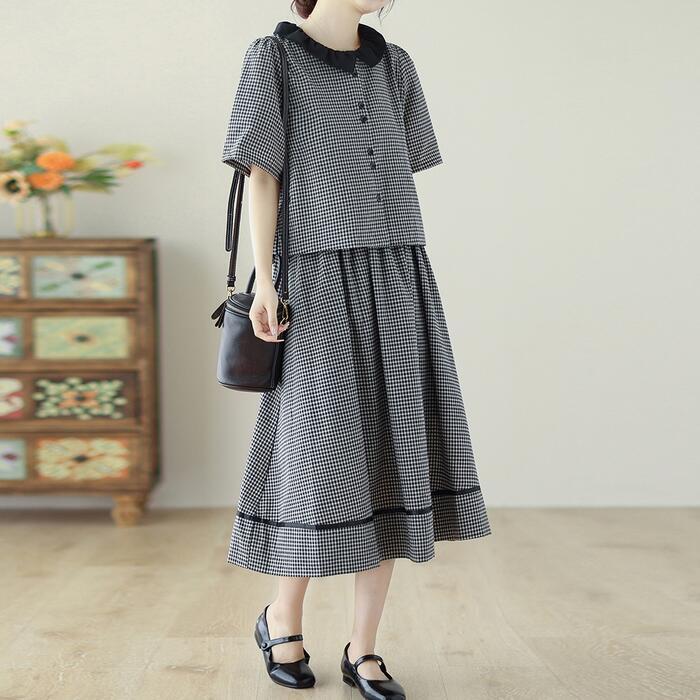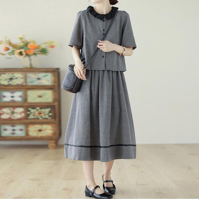 大きいサイズ セットアップ レディース スカート ブラウス シャツ ギンガムチェック トップス 半袖 エレガント カジュアル きれいめ ミモレ丈 大人 可愛い 2点セット おしゃれ 体型カバー ブラック 黒 春 秋 夏 20代 30代 40代 50代