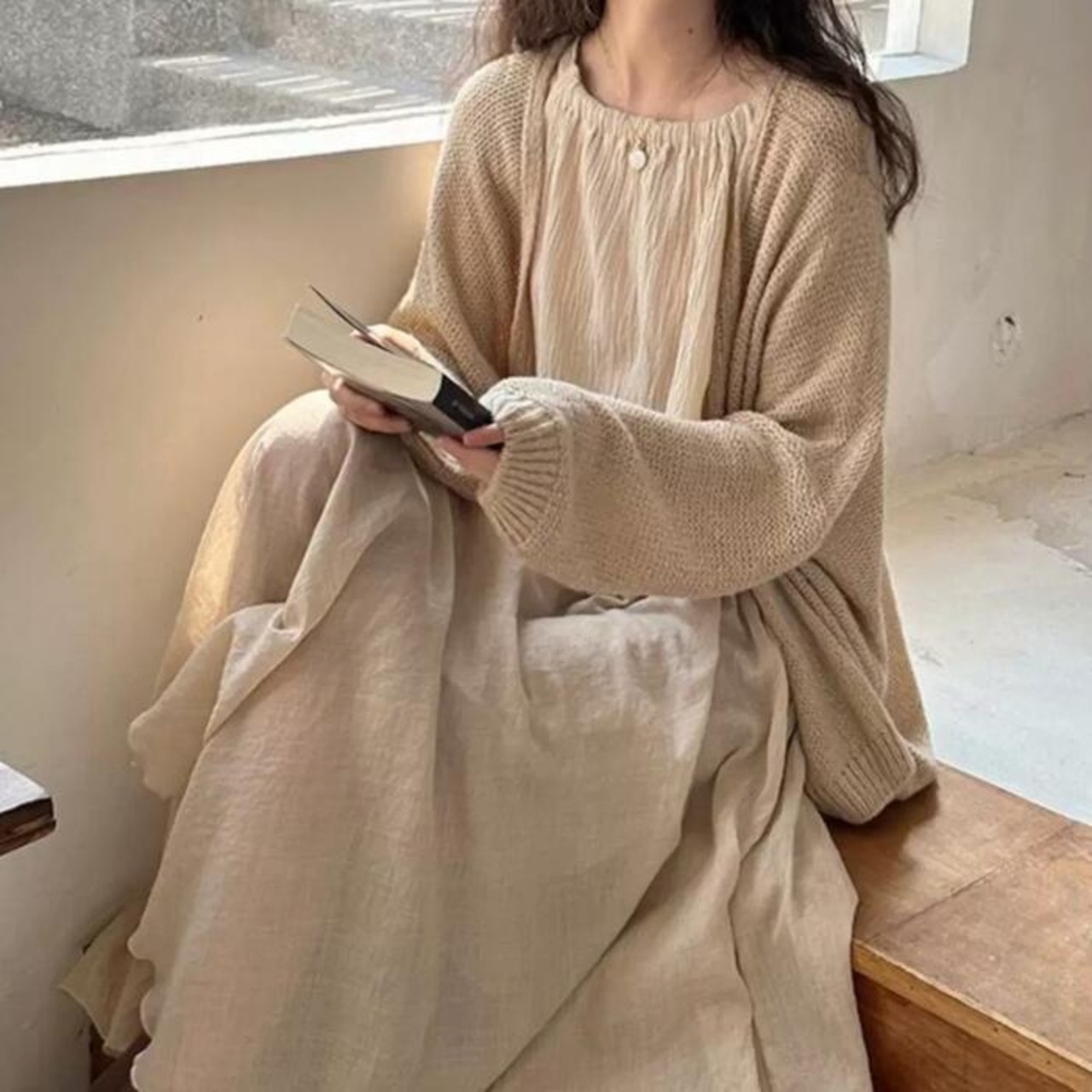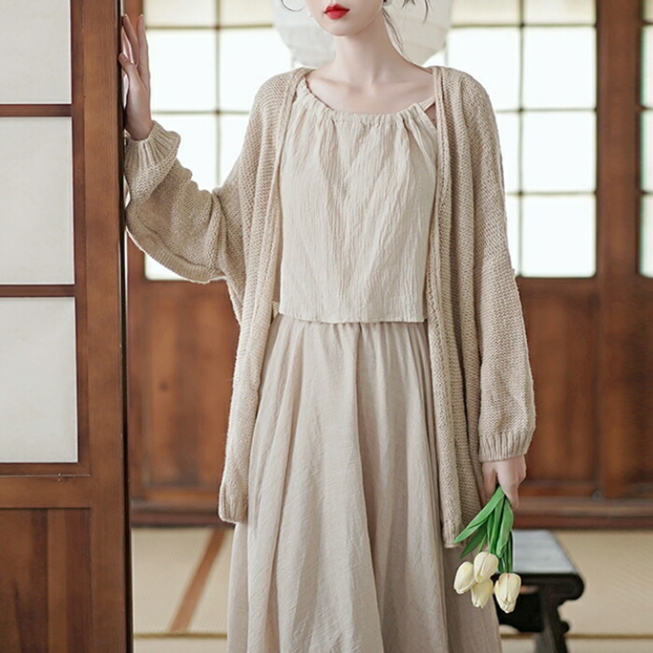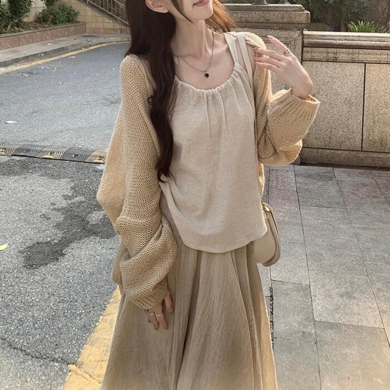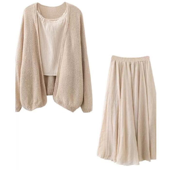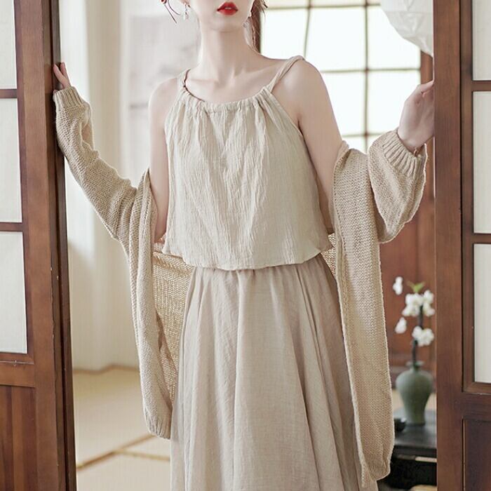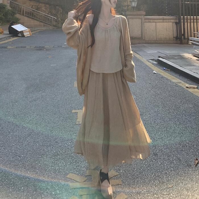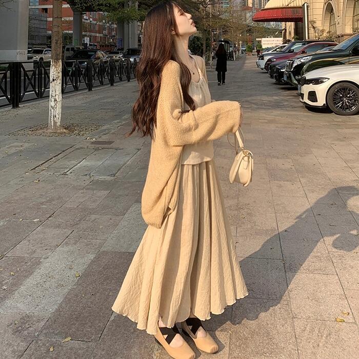 カーディガン、キャミソール、フレアスカートの3点セット。