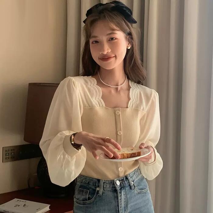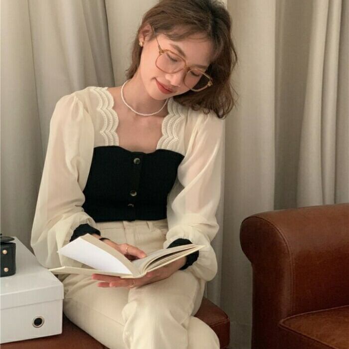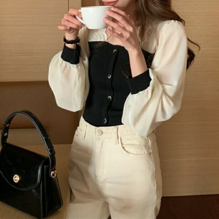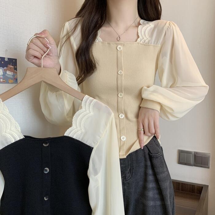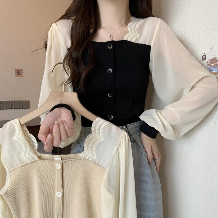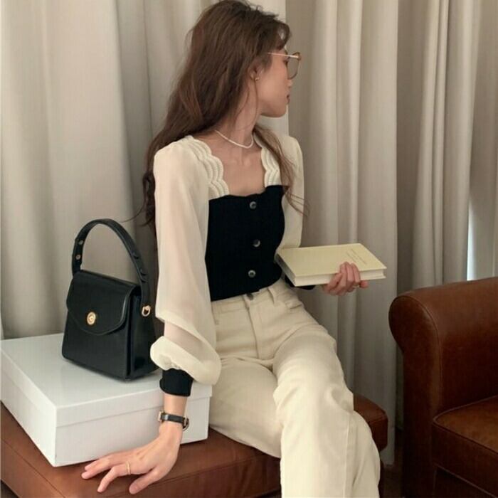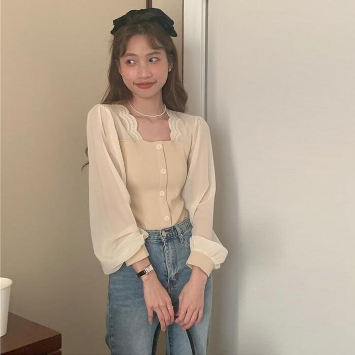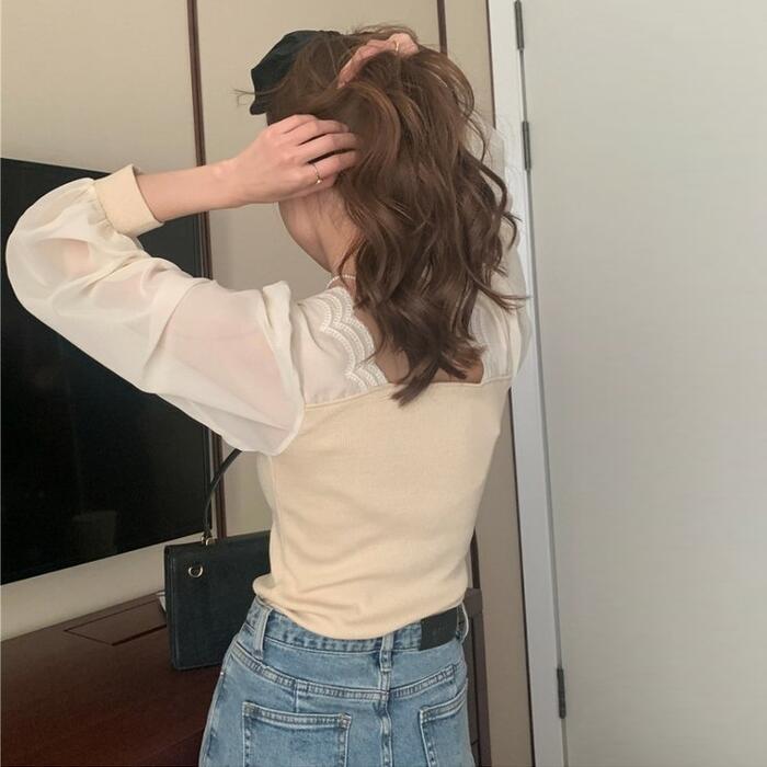 シフォンとニットをドッキングさせた異素材ミックスのトップス。