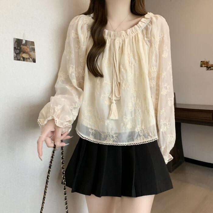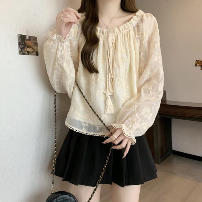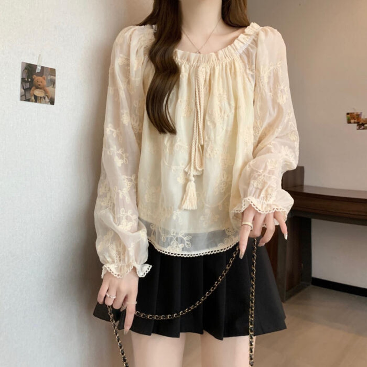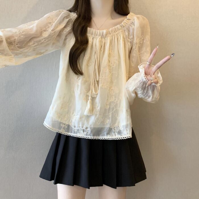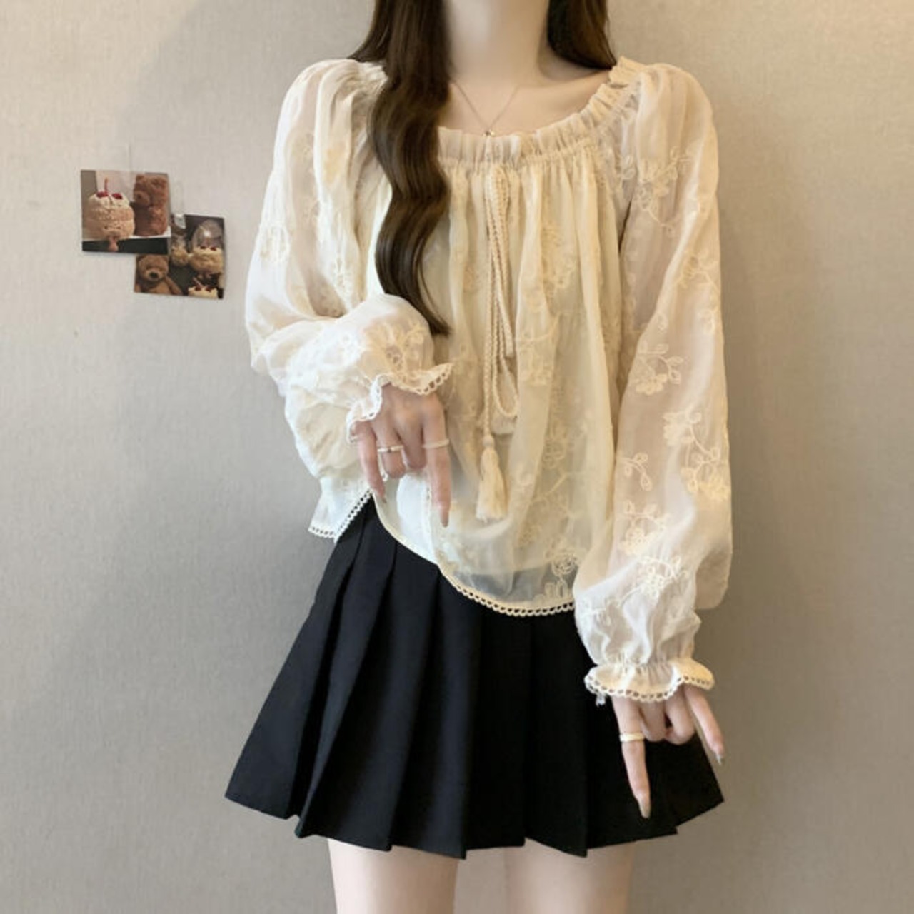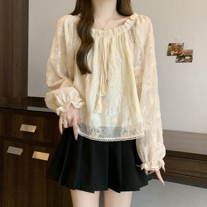 透け感のある素材に花柄の刺繍を施したフェミニンなブラウス。