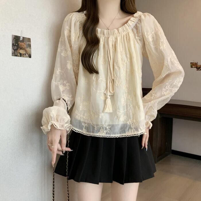 大きいサイズ シンプル ナチュラル トップス シャツ ブラウスTシャツ カットソー プルオーバー 刺繍 花柄 レディース エレガント 大人 可愛い きれいめ カジュアル フェミニン シアー 透け感 長袖 フリル リボン ベージュ 春 秋 冬 20代 30代 40代 50代