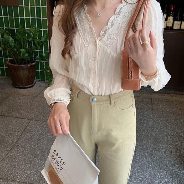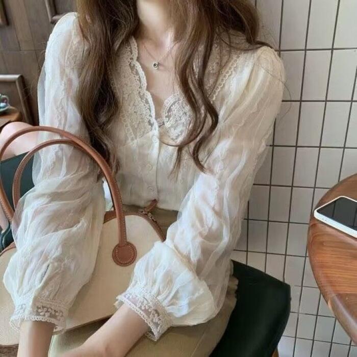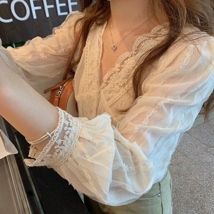 首元と袖口のレースが可愛いシアーブラウス。