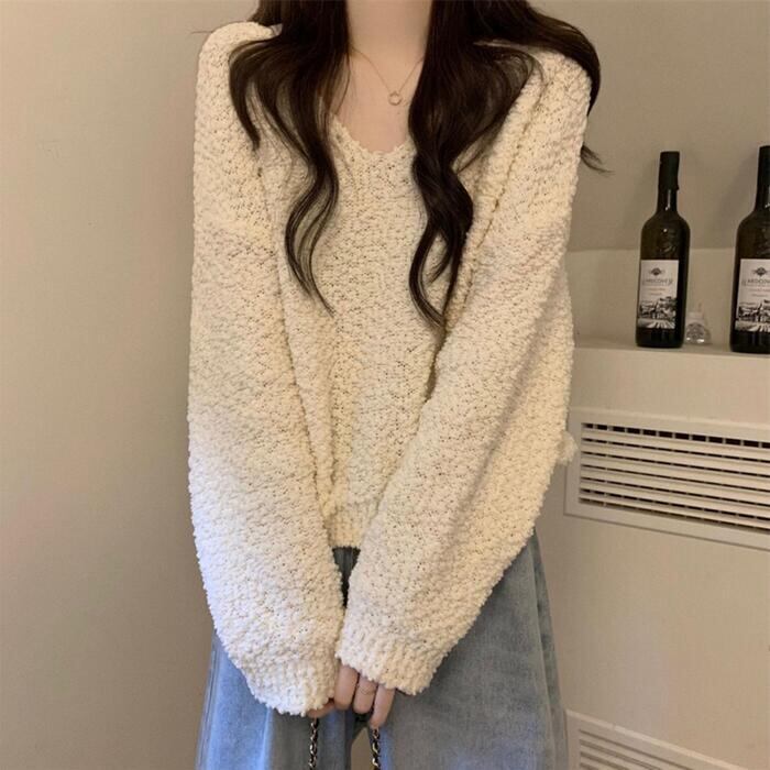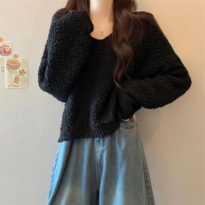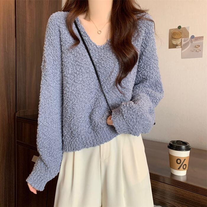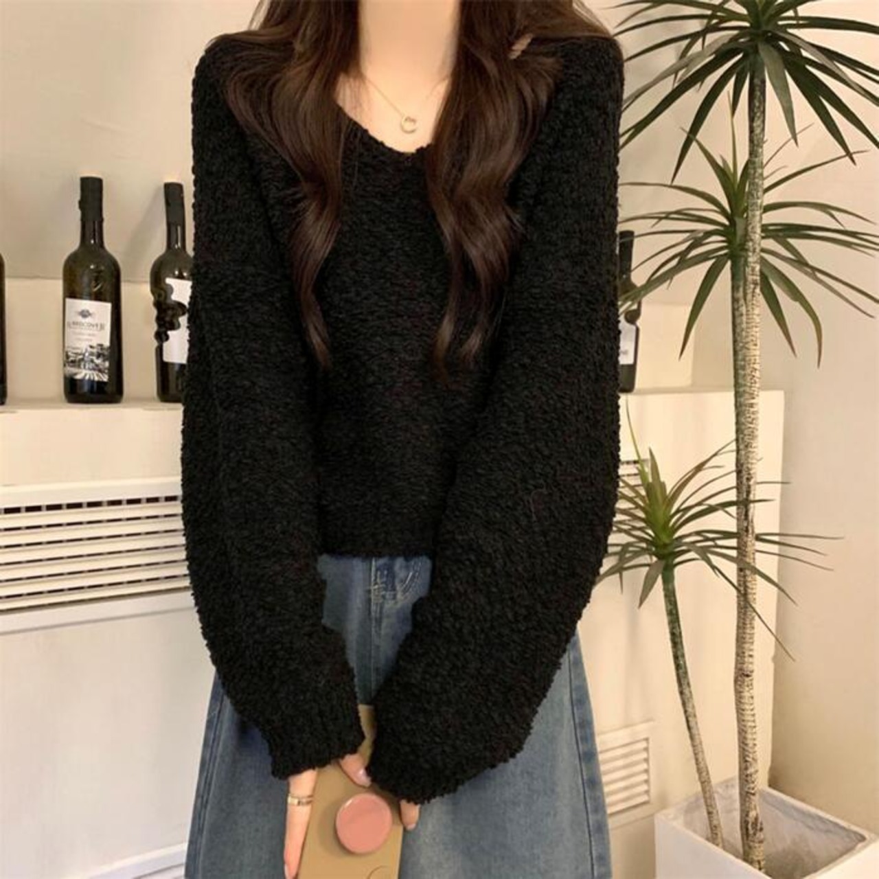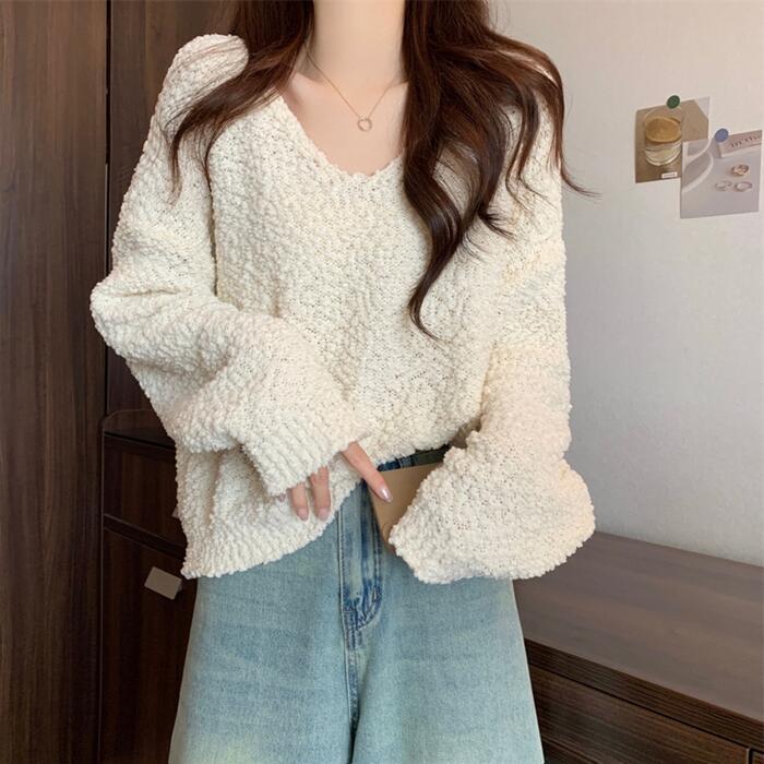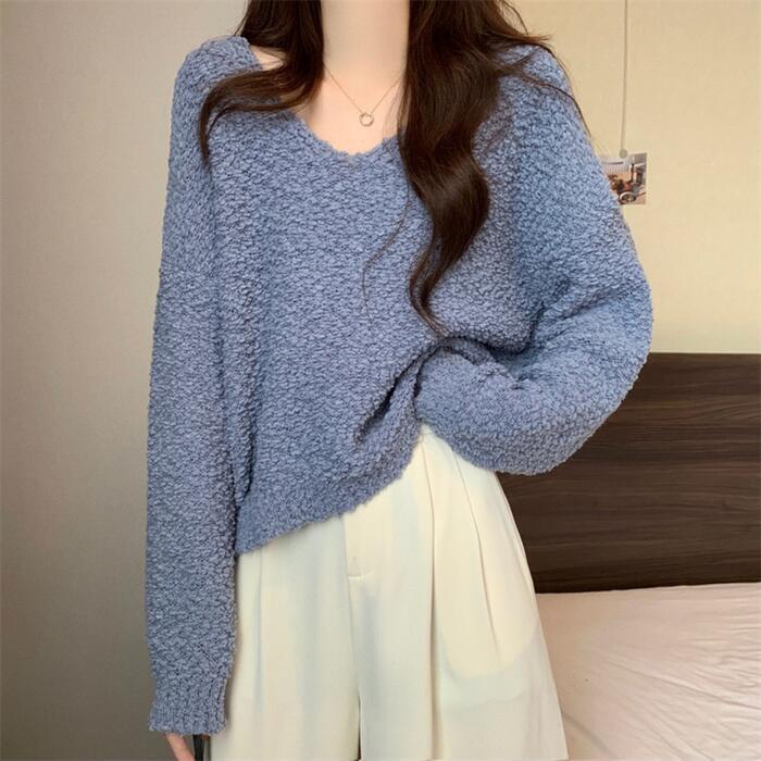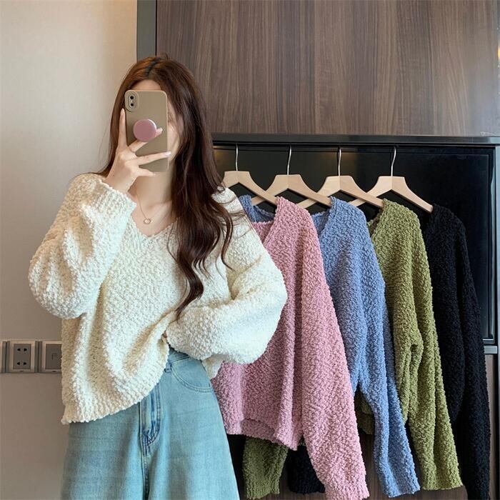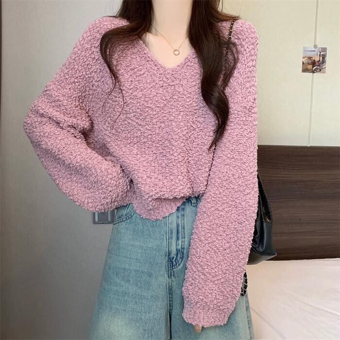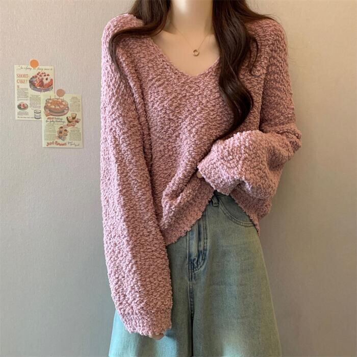 全5色 体型カバー ゆったり トップス ニット ブークレー カットソー セーター レディース エレガント 大人 可愛い きれいめ カジュアル フェミニン 長袖 ナチュラル シンプル Vネック ピンク ブルー 青 グリーン 緑 ホワイト 白 ブラック 黒 春 秋 冬 20代 30代 40代 50代