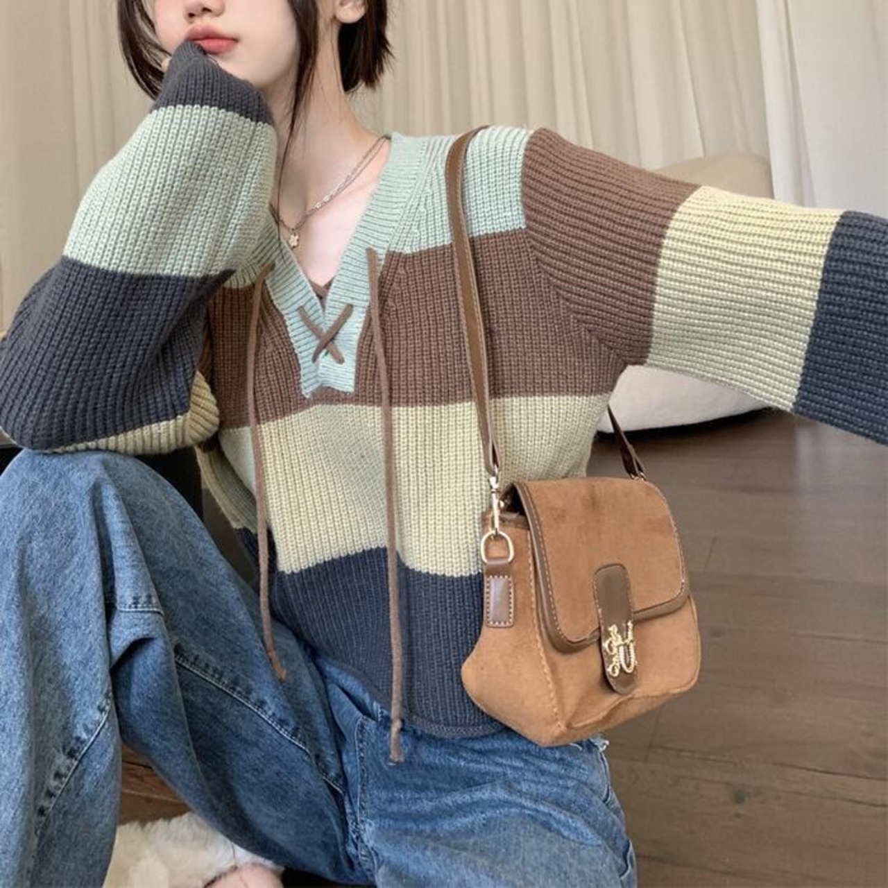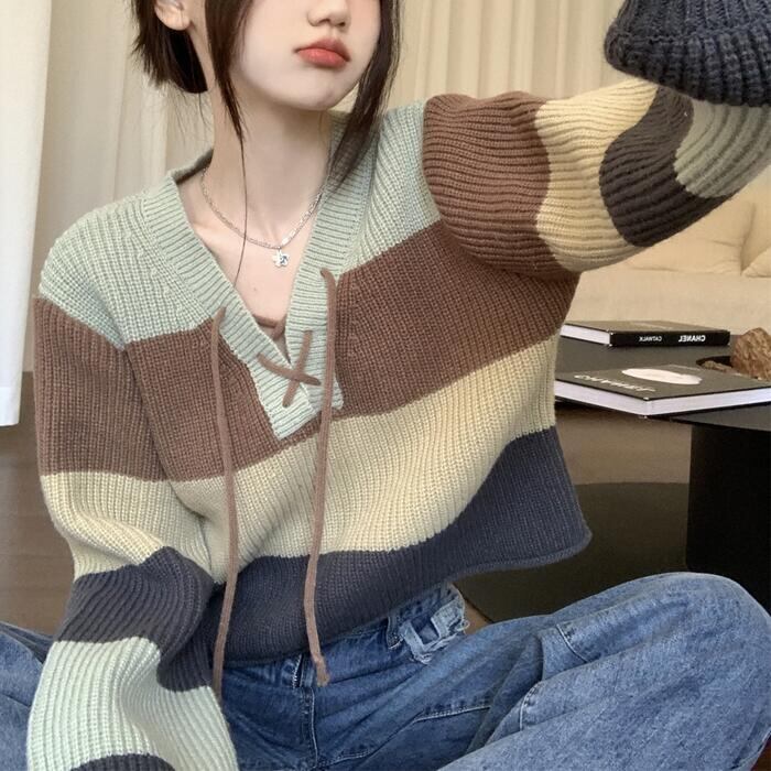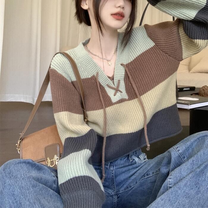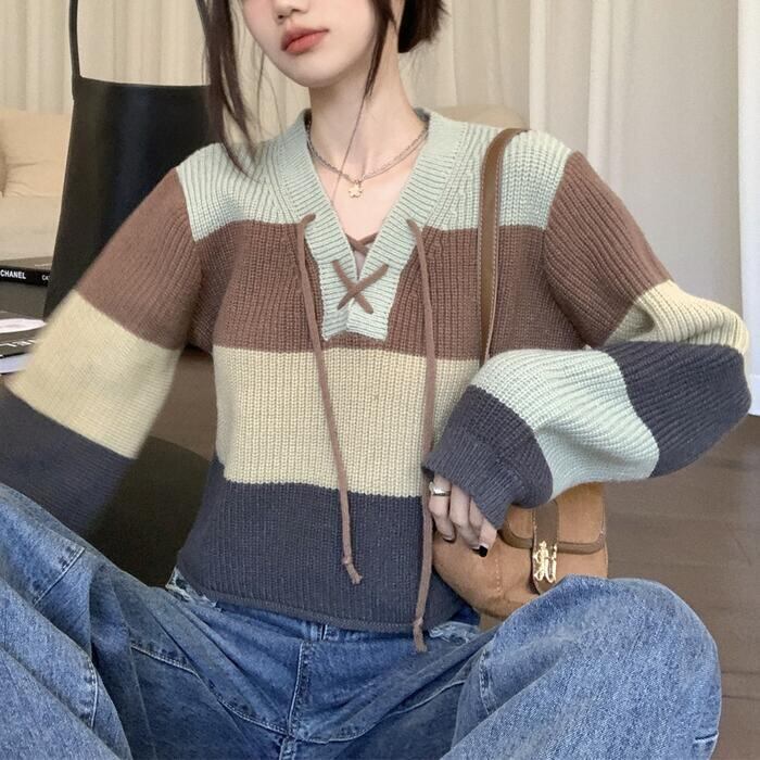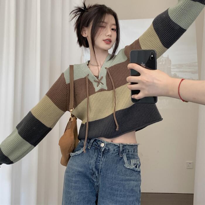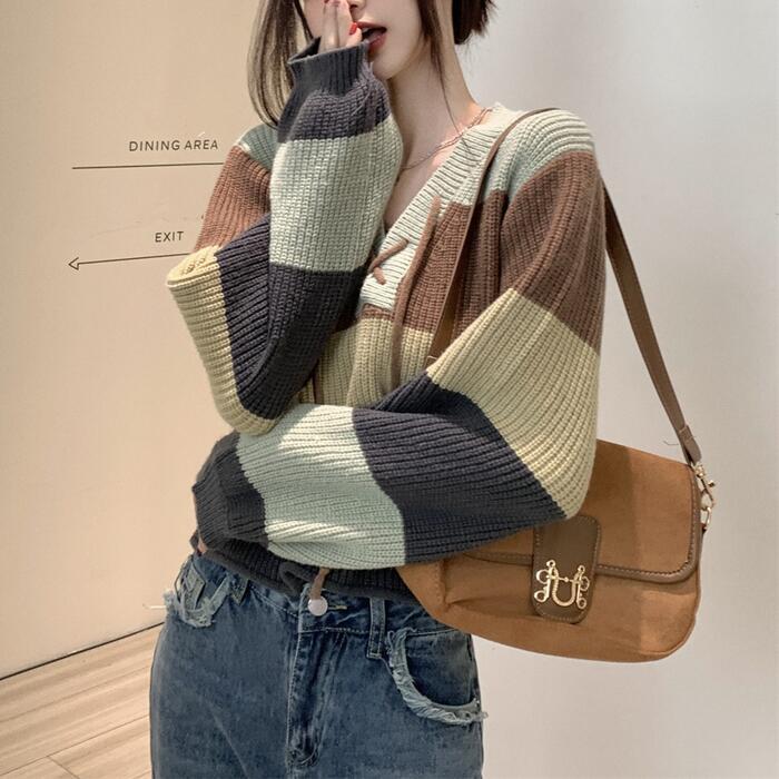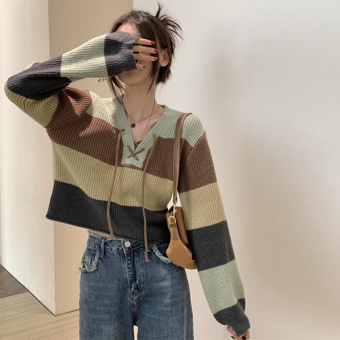 体型カバー ゆったり トップス ニット ボーダー カットソー セーター レディース エレガント 大人 可愛い きれいめ カジュアル フェミニン レースアップ 長袖 Vネック ナチュラル ショート丈 クロップド丈 グリーン 緑 春 秋 冬 20代 30代 40代 50代