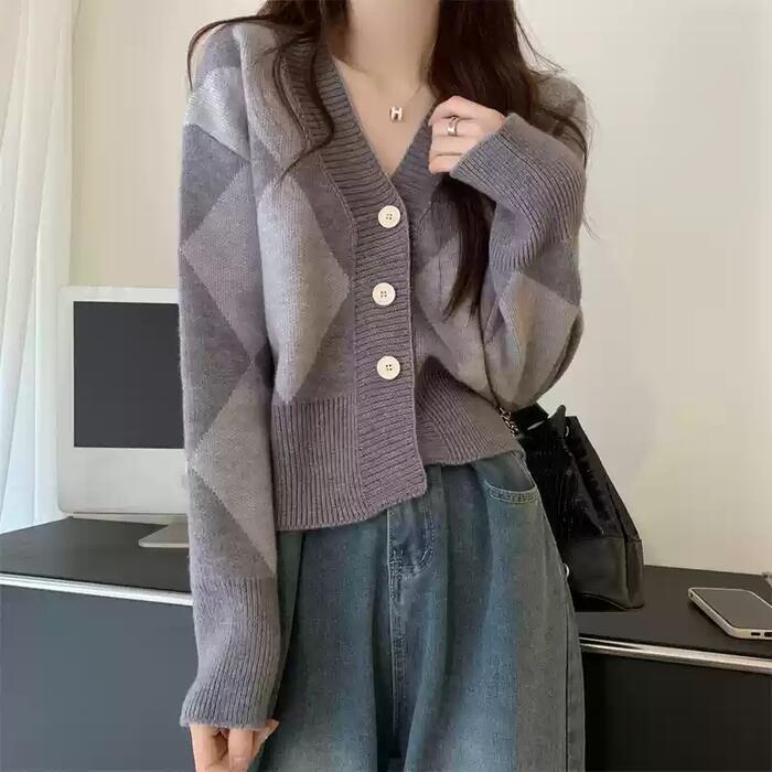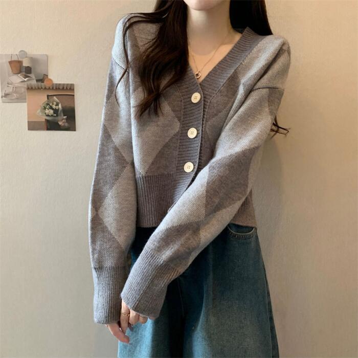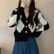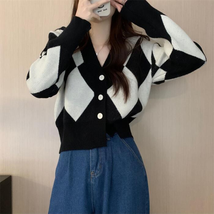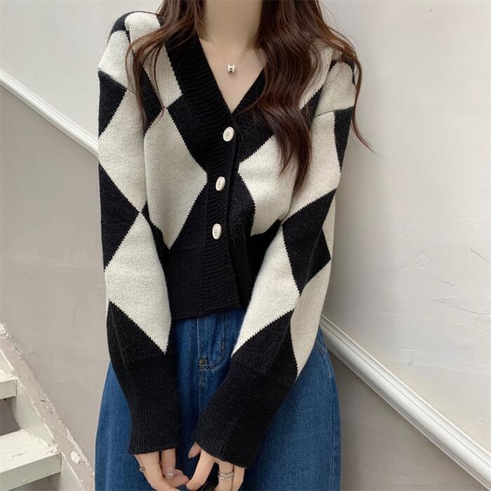 ダイヤチェック柄が可愛いニットショートカーディガン。