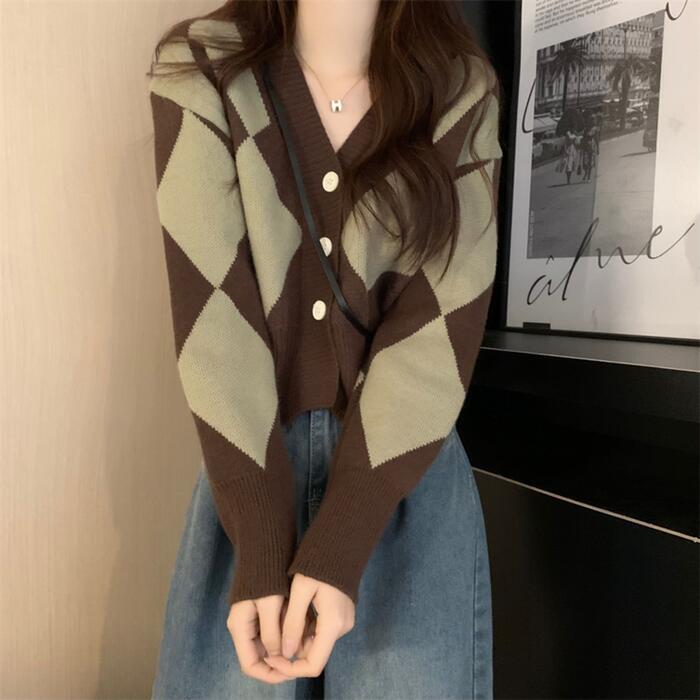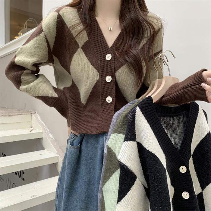 全4色 体型カバー ショート丈 クロップド丈 シンプル トップス カーディガン ニット ダイヤ チェック 羽織り ジャケット ボレロ レディース エレガント 大人 可愛い きれいめ カジュアル フェミニン 長袖 トラッド グリーン 緑 ブラウン グレー ブラック 黒 春 秋 冬 20代 30代 40代 50代