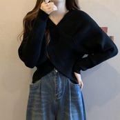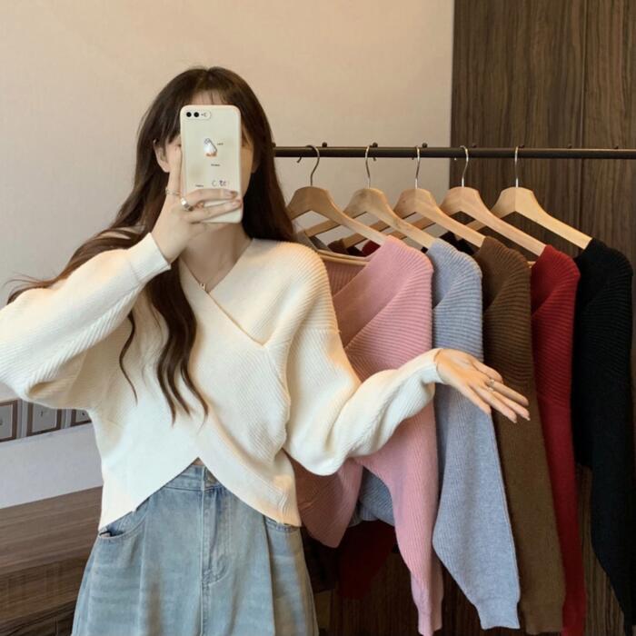 全6色 体型カバー ショート丈 クロップド丈 カシュクール トップス ニット クロス カットソー セーター アシンメトリー レディース エレガント 大人 可愛い きれいめ カジュアル フェミニン 長袖 ナチュラル シンプル Vネック ピンク レッド 赤 グレー ブラウン ブラック 黒 春 秋 冬 20代 30代 40代 50代