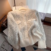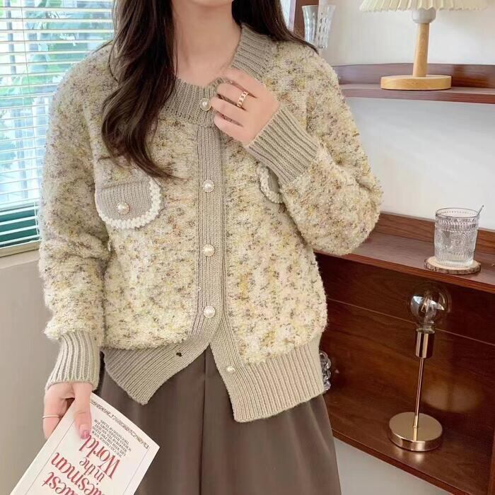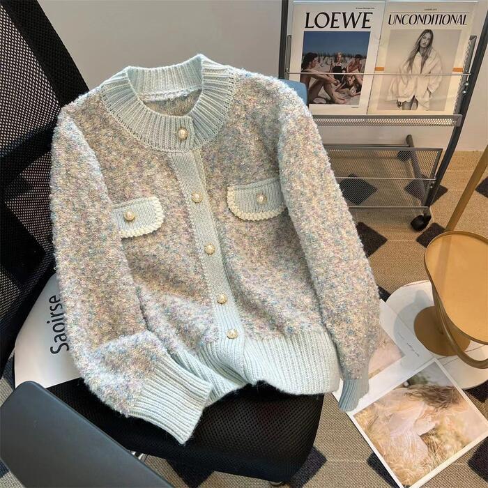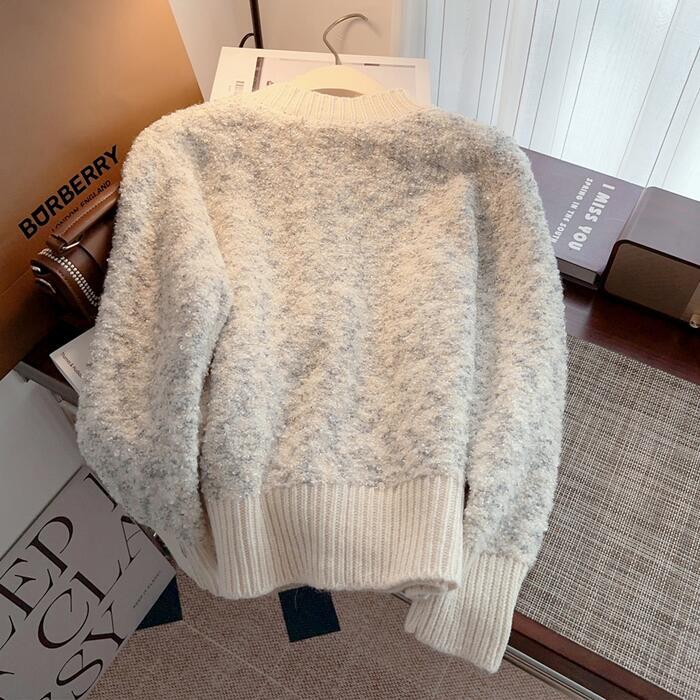 ループの立体感と淡いミックスカラーが上品なムードのニットカーディガン。