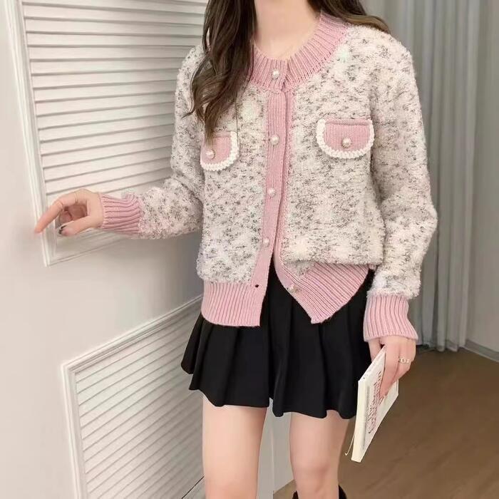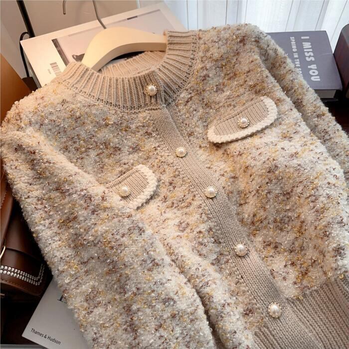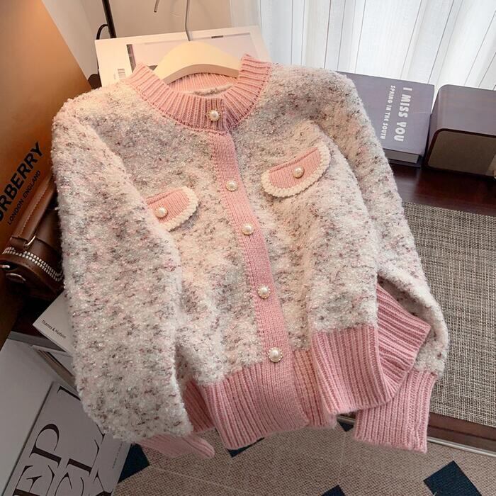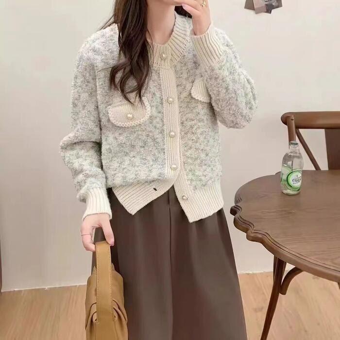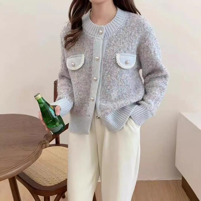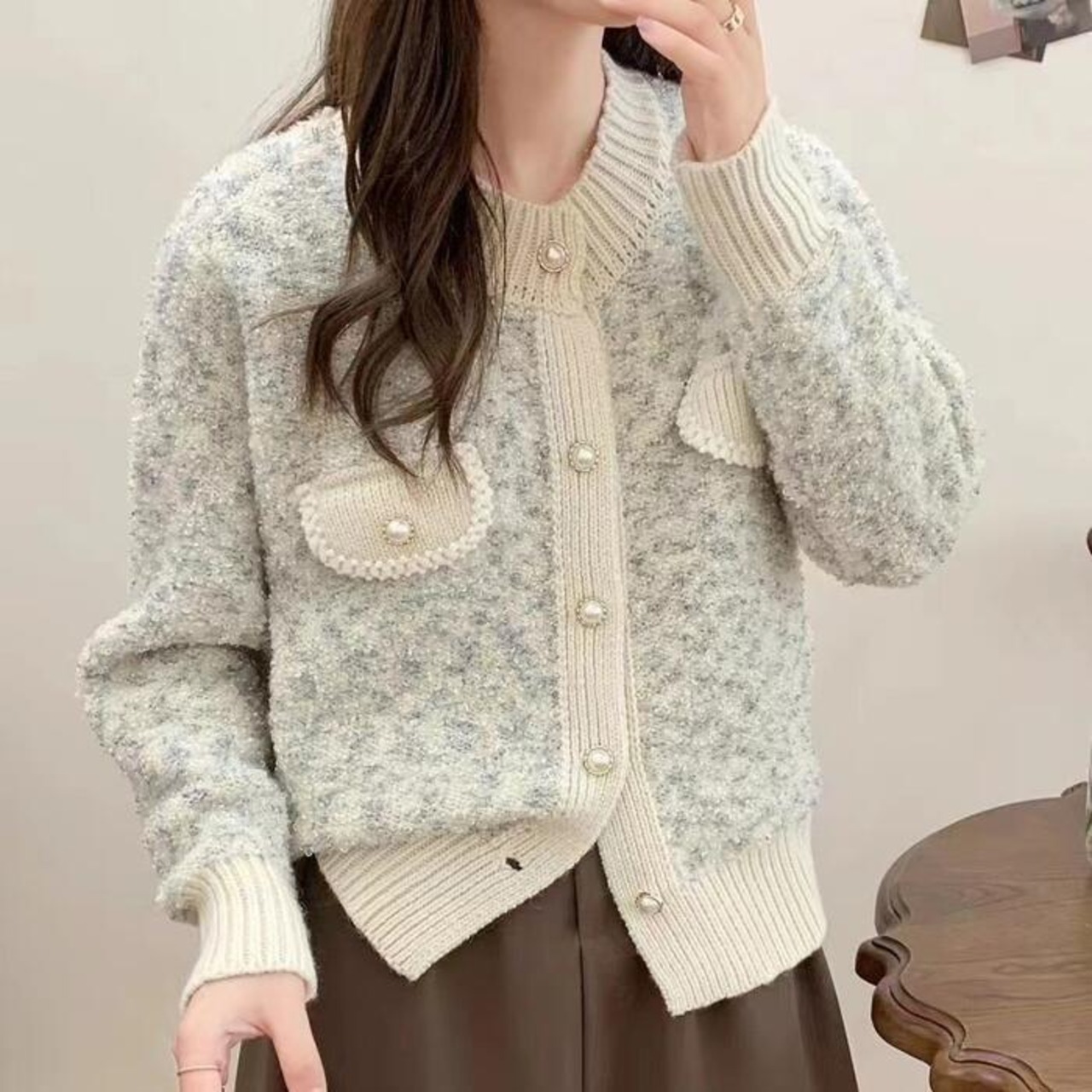 全4色 体型カバー トップス カーディガン ニット ブークレー 羽織り セーター ジャケット レディース エレガント 大人 可愛い きれいめ カジュアル フェミニン 長袖 上品 パール 通勤 オフィス ブルー 青 ベージュ ピンク 春 秋 冬 20代 30代 40代 50代