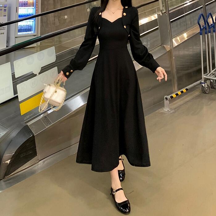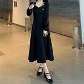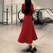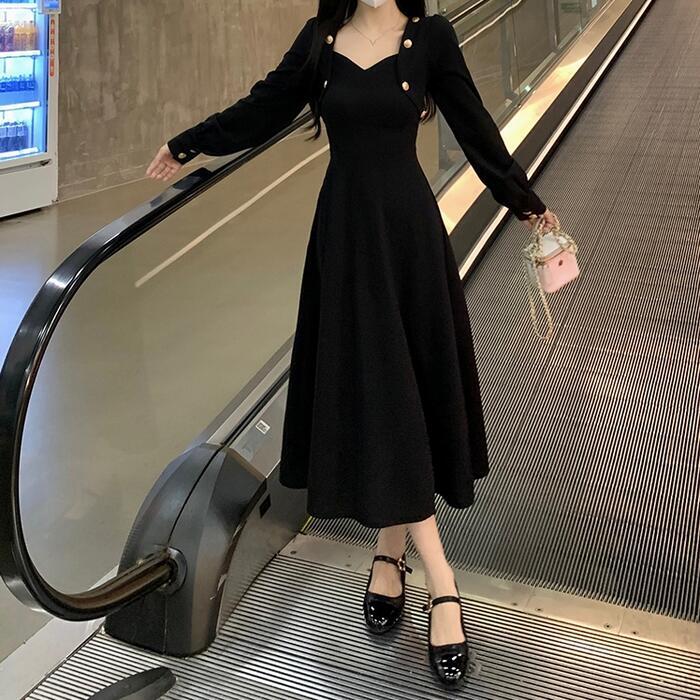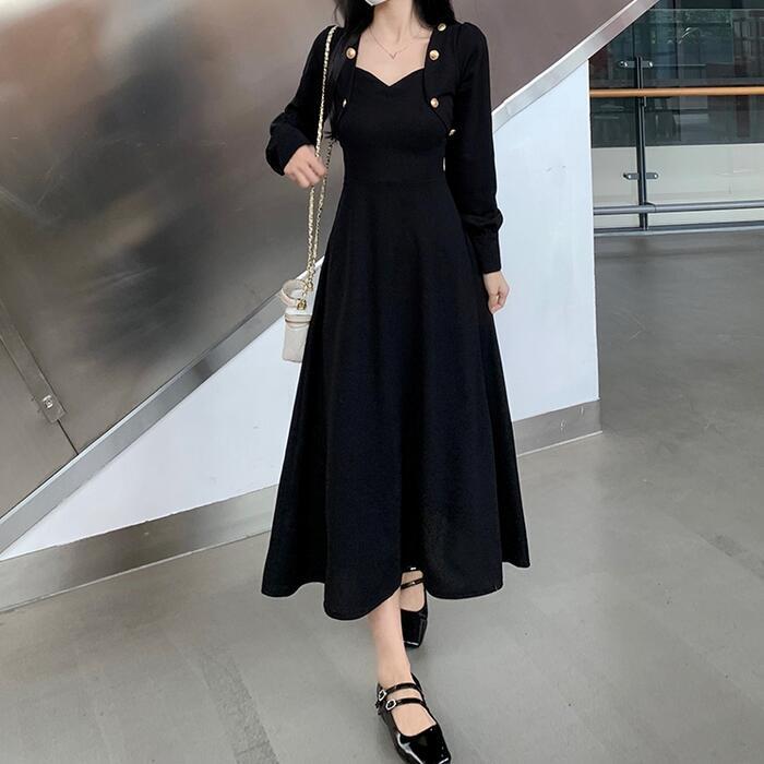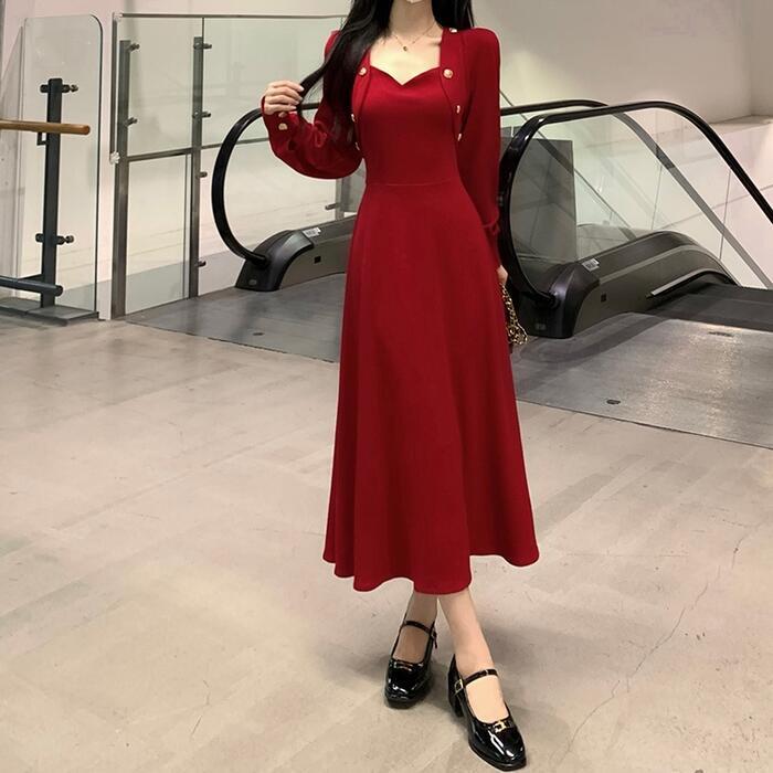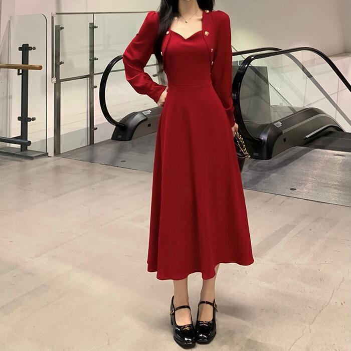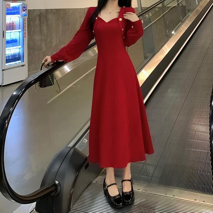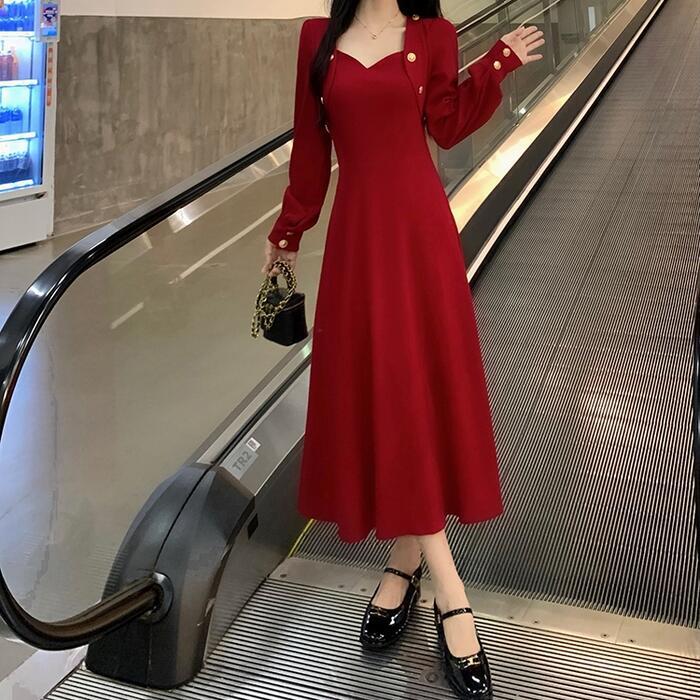 全2色 大きいサイズ 体型カバー ワンピース ワンピ ドレス 袖あり レイヤード風 ニット レディース エレガント きれいめ カジュアル 長袖 大人 可愛い フェミニン ミモレ丈 ハートネック Aライン お呼ばれ シンプル レッド 赤 ブラック 黒 春 秋 冬 20代 30代 40代 50代