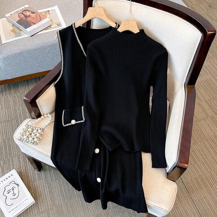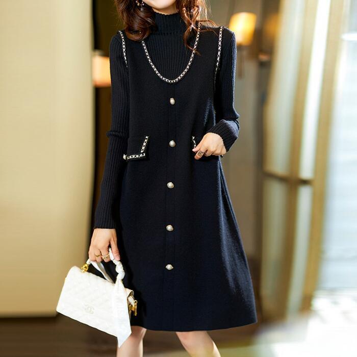 大きいサイズ 体型カバー セットアップ レディース ニット トップス ワンピース 長袖 2点セット エレガント カジュアル きれいめ フェミニン ひざ丈 大人 可愛い ハイネック おしゃれ シンプル レイヤード ブラック 黒 春 秋 夏 20代 30代 40代 50代