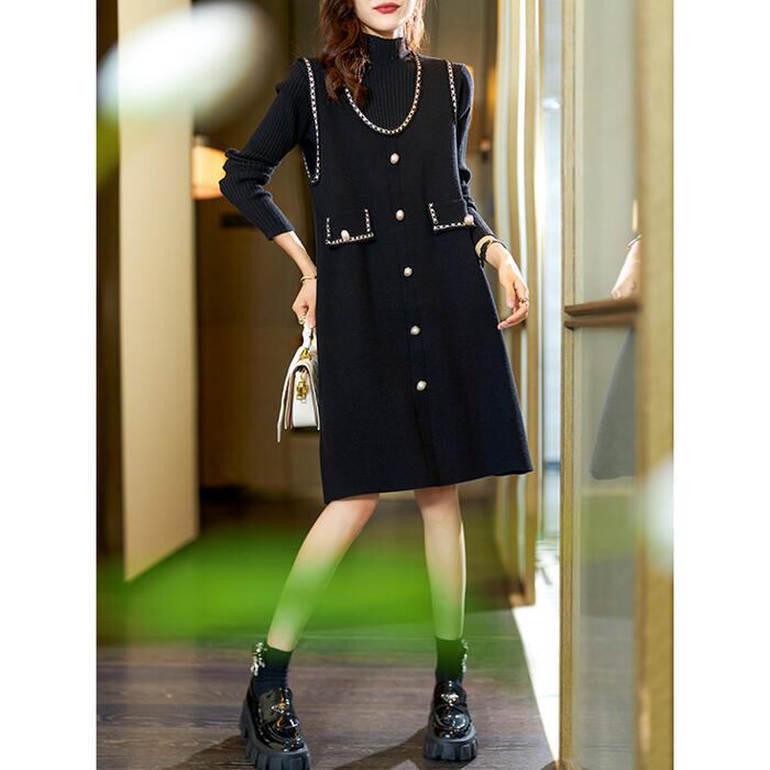 ハイネックのリブニットトップスとノースリーブワンピースのセット。