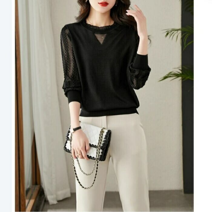 首元と袖の透け感が華やかな印象のニットトップス。