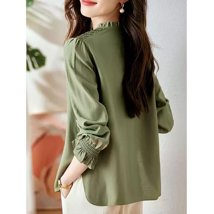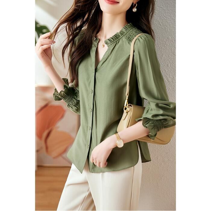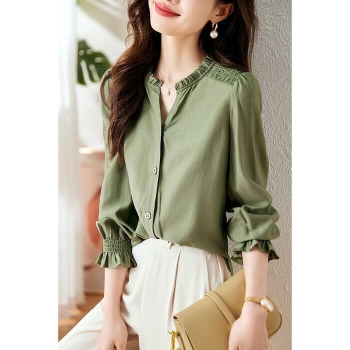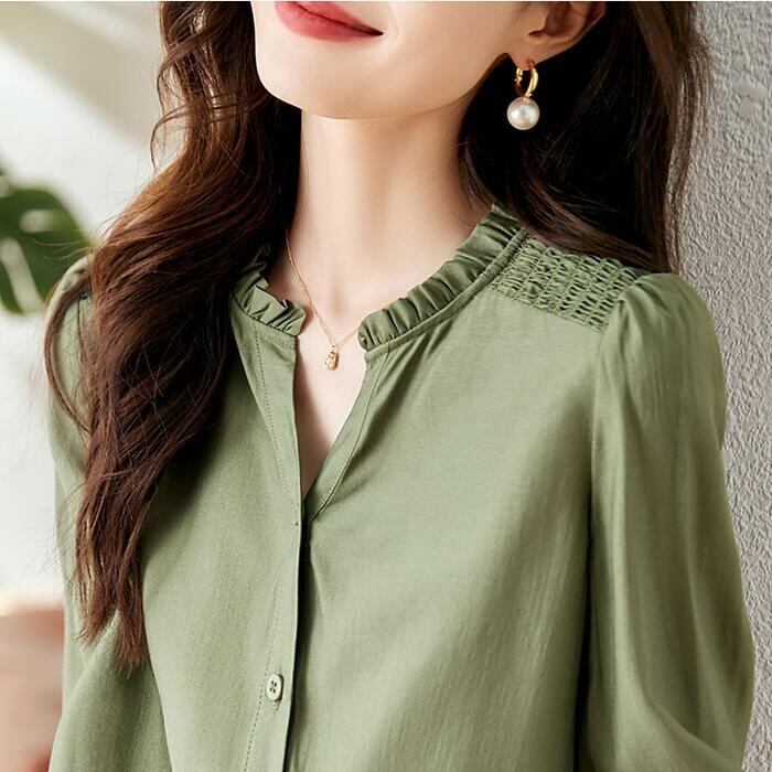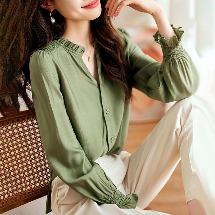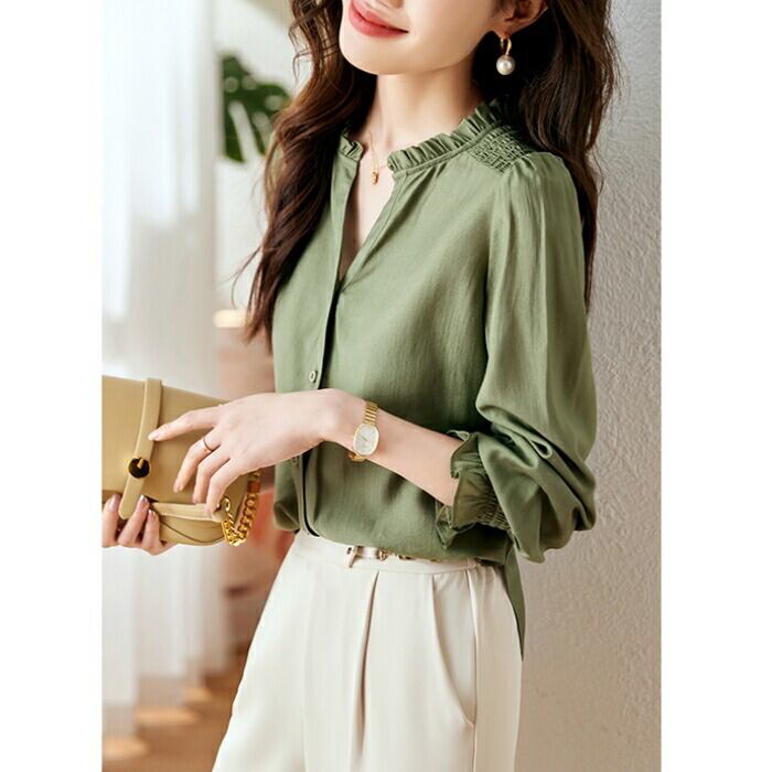 大きいサイズ トップス ブラウス シャツ レディース エレガント 大人 可愛い きれいめ カジュアル フェミニン 長袖 シャーリング フリル スキッパー ナチュラル 上品 通勤 オフィス 体型カバー シンプル グリーン 緑 春 秋 冬 20代 30代 40代 50代