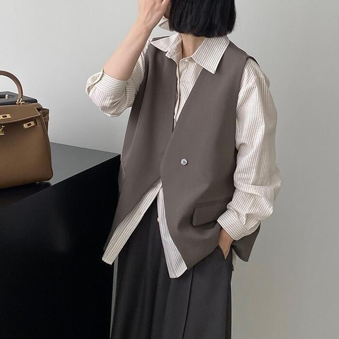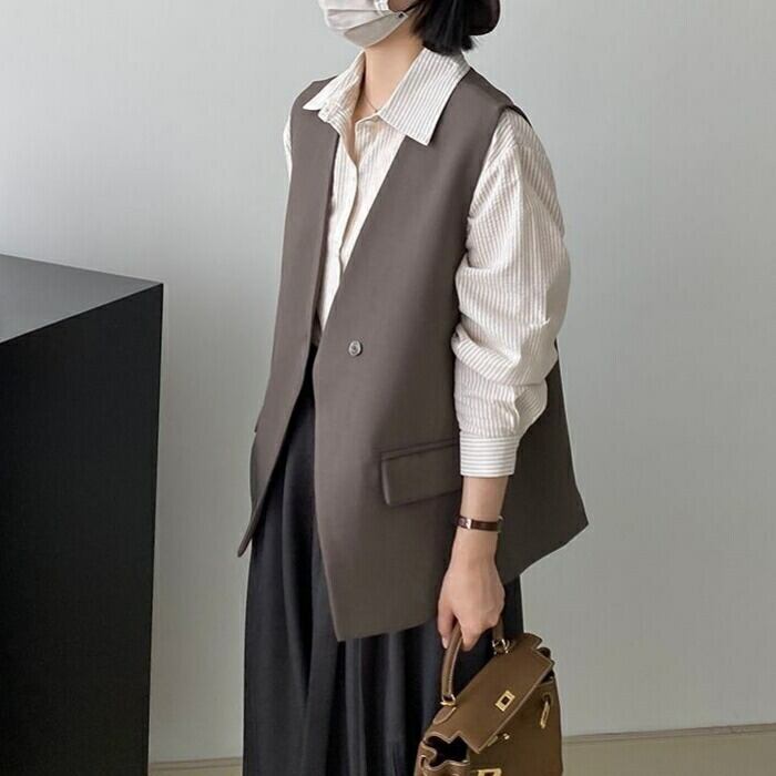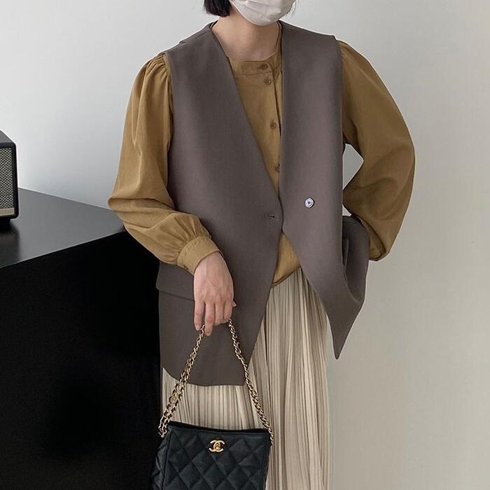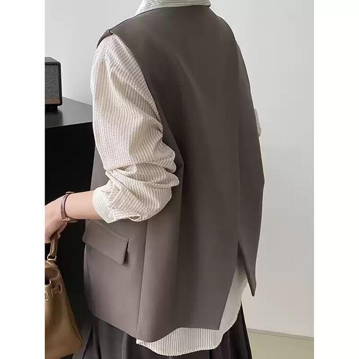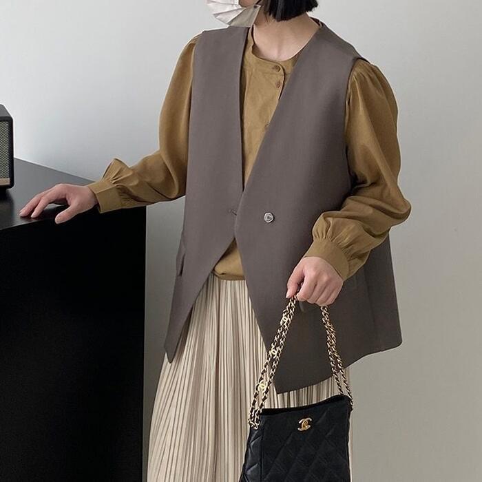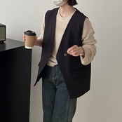 全2色 大きいサイズ ベスト ジレ トップス カーディガン 羽織り ジャケット レディース エレガント 大人 可愛い きれいめ カジュアル フェミニン ノースリーブ シンプル レイヤード 体型カバー Vネック ゆったり ベージュ ブラック 黒 春 秋 冬 20代 30代 40代 50代