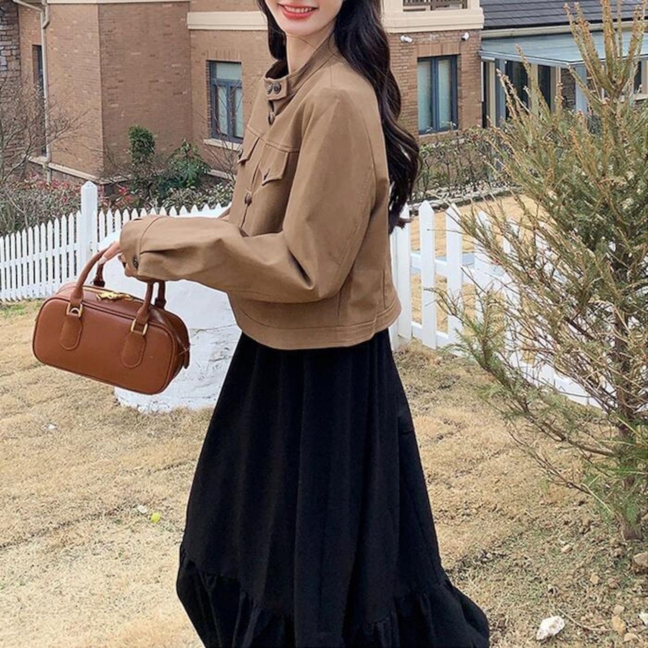 大きいサイズ 体型カバー レイヤード セットアップ レディース ジャケット ワンピース 長袖 キャミワンピ ティアード 2点セット エレガント カジュアル きれいめ フェミニン ミモレ丈 大人 可愛い 楽ちん おしゃれ シンプル ブラウン ブラック 黒 春 秋 夏 20代 30代 40代 50代