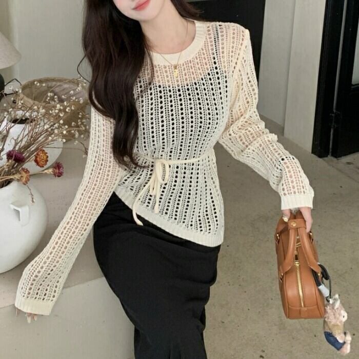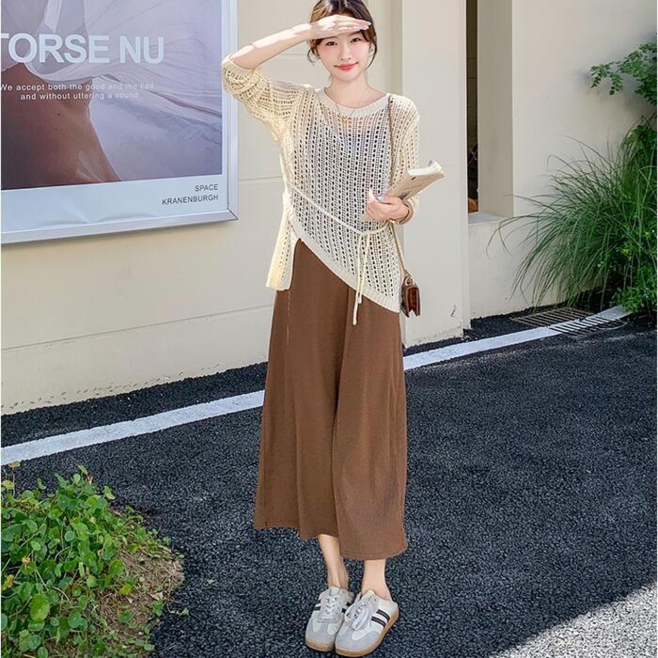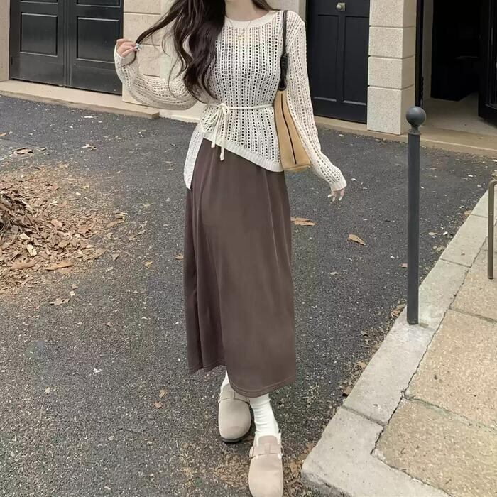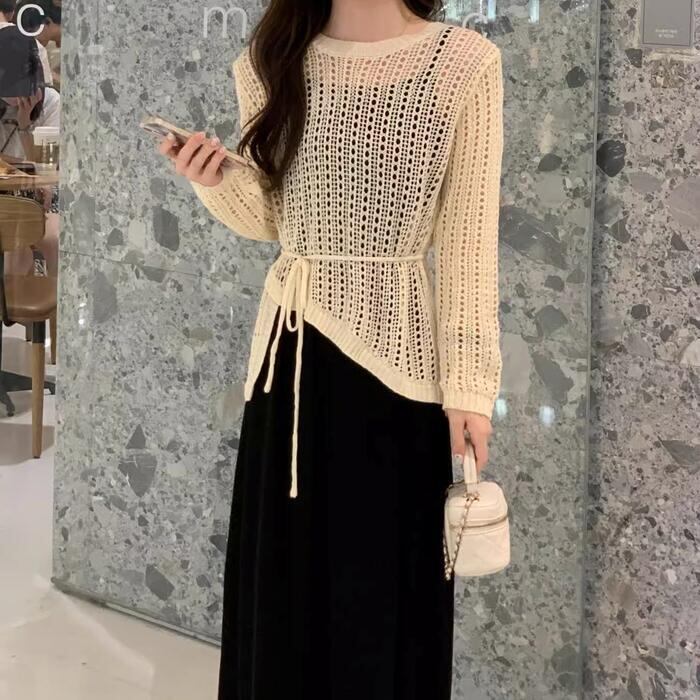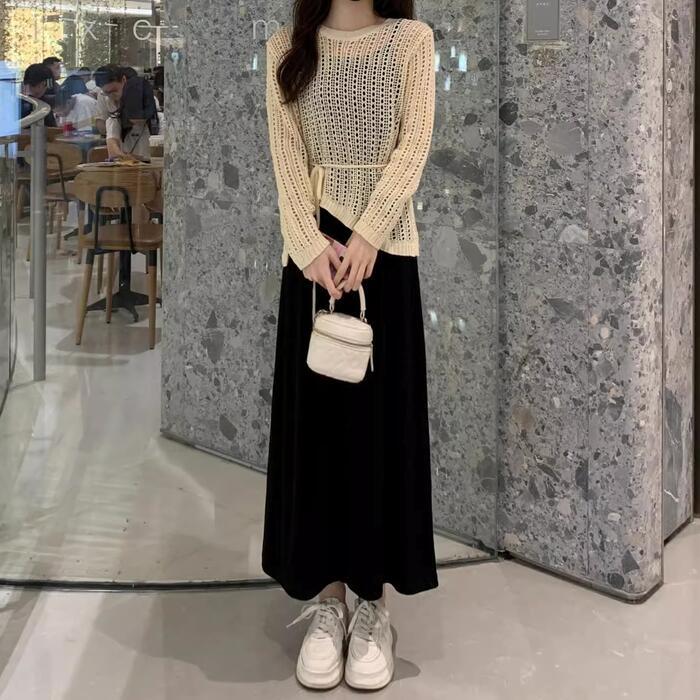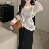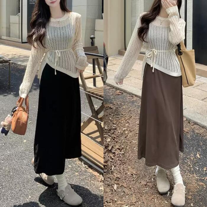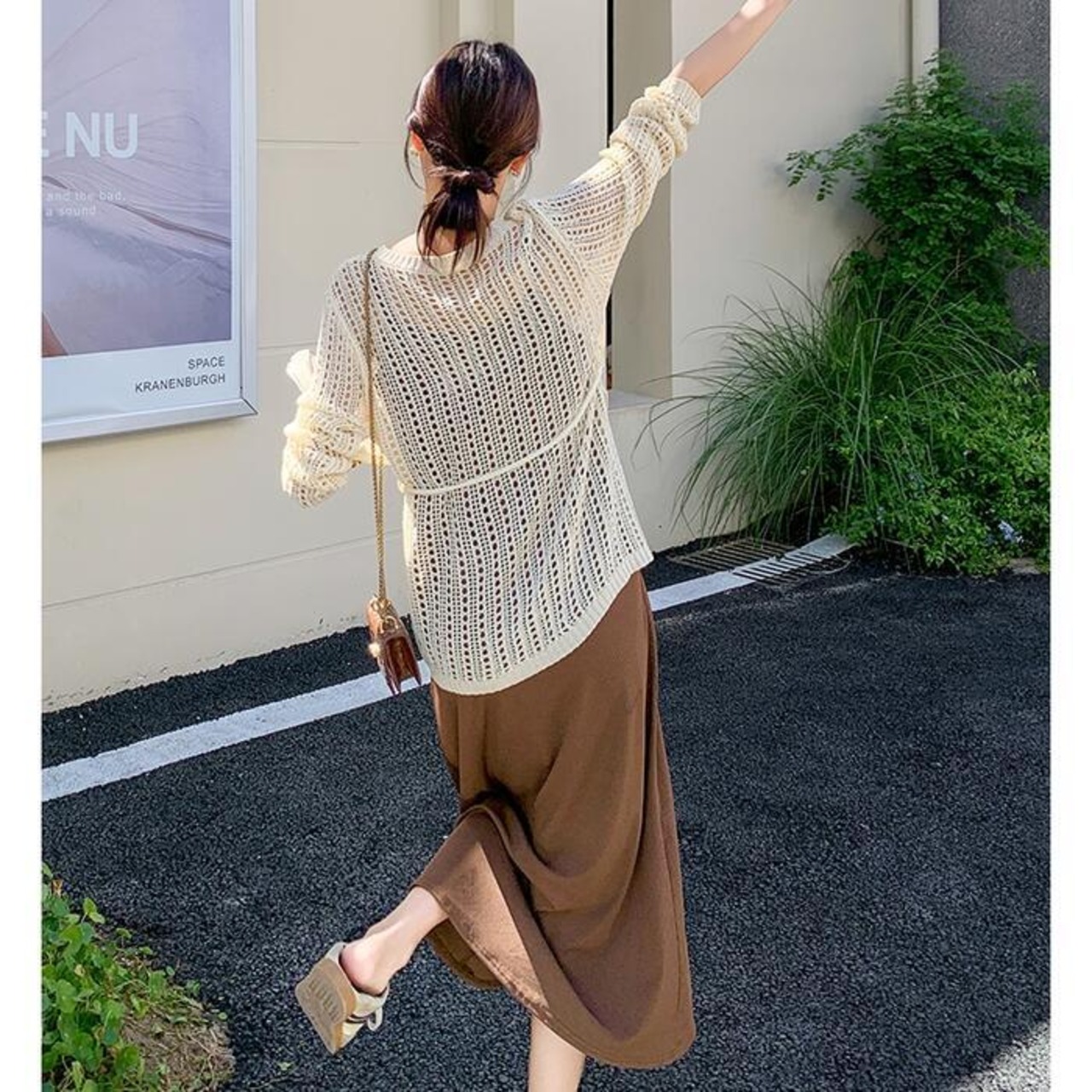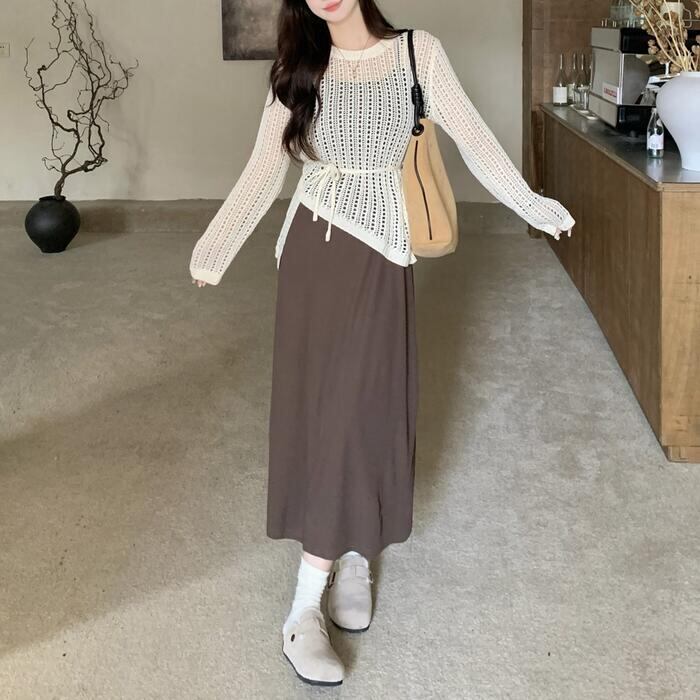 全2色 大きいサイズ 体型カバー レイヤード ゆったり アシンメトリー セットアップ レディース ニット ワンピース 長袖 キャミワンピ クロシェ 透かし編み 2点セット エレガント カジュアル きれいめ フェミニン ミモレ丈 大人 可愛い おしゃれ ブラウン ベージュ ブラック 黒 春 秋 冬 20代 30代 40代 50代