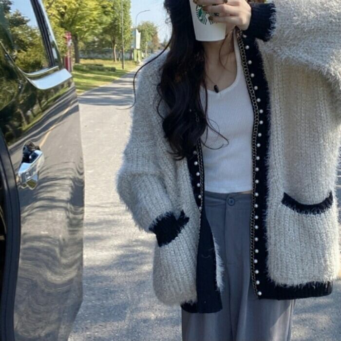 全2色 大きいサイズ トップス カーディガン シャギー ニット 羽織り セーター ジャケット パール レディース エレガント 大人 可愛い きれいめ カジュアル フェミニン 長袖 ゆったり 体型カバー ベージュ グレー 春 秋 冬 20代 30代 40代 50代