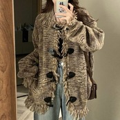 大きいサイズ トップス カーディガン ケーブル ニット 羽織り フリンジ ジャケット レディース エレガント 大人 可愛い きれいめ カジュアル フェミニン 長袖 トグル ゆったり ダメージ レトロ 体型カバー ブラウン 春 秋 冬 20代 30代 40代 50代