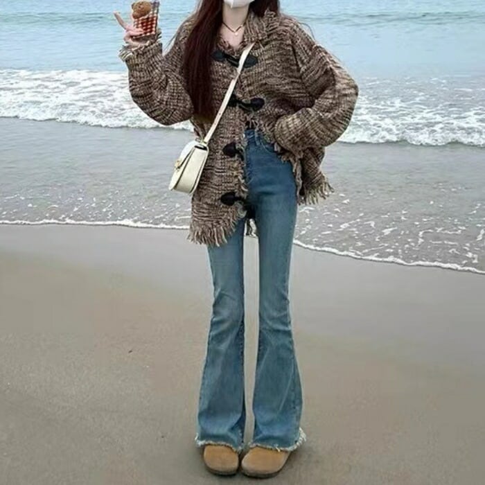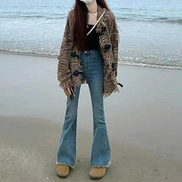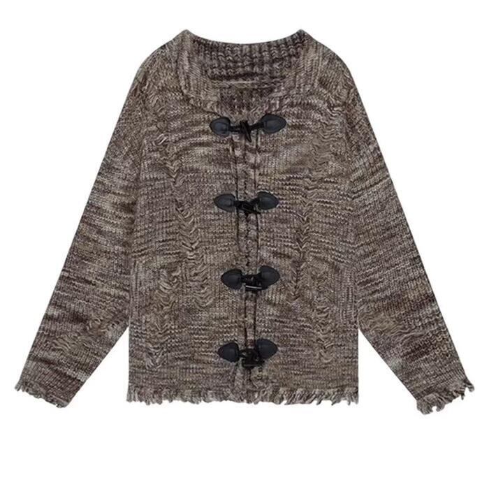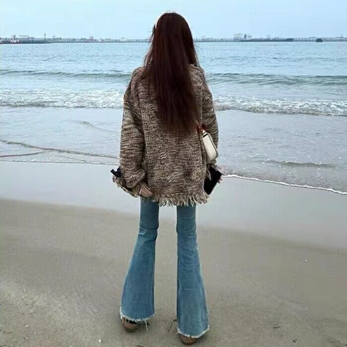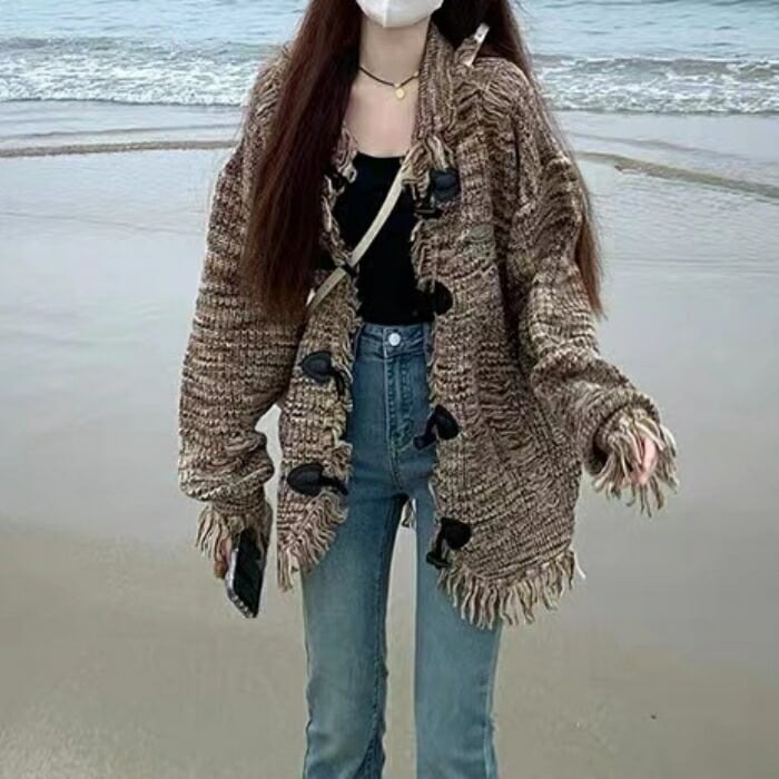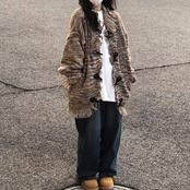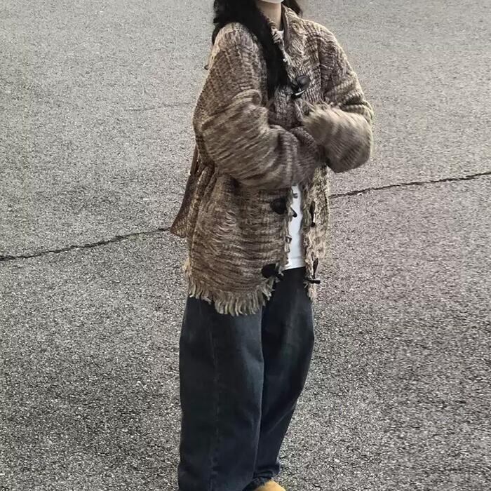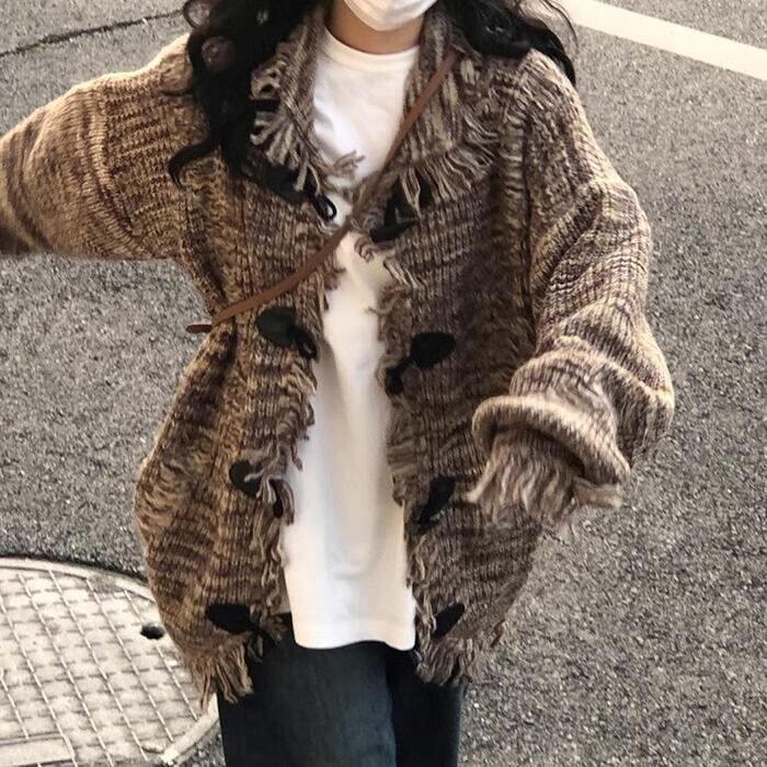 フリンジ×ダメージ加工がレトロン雰囲気のニットカーディガン。