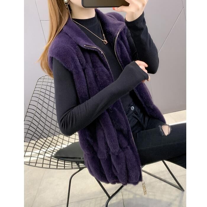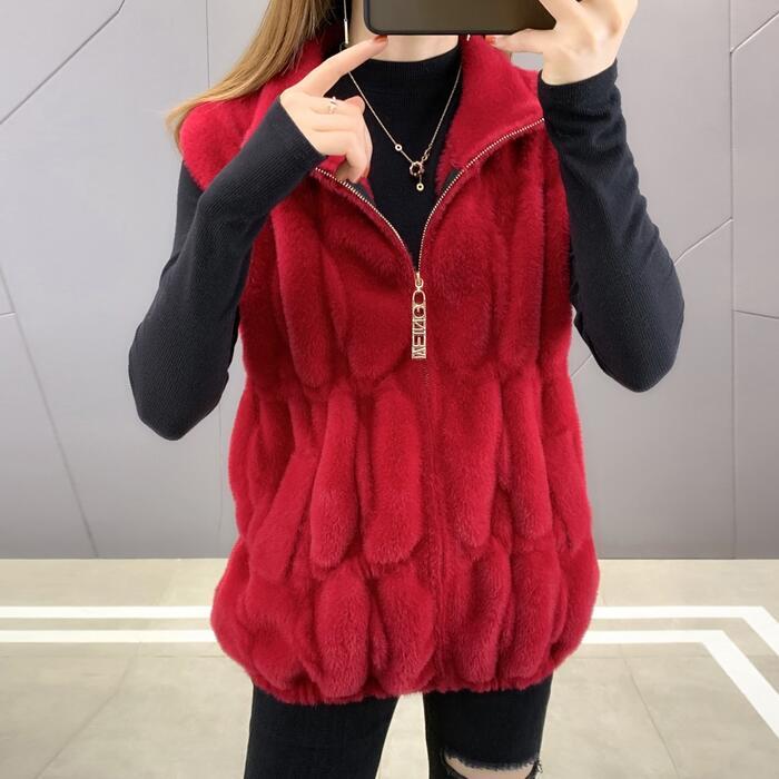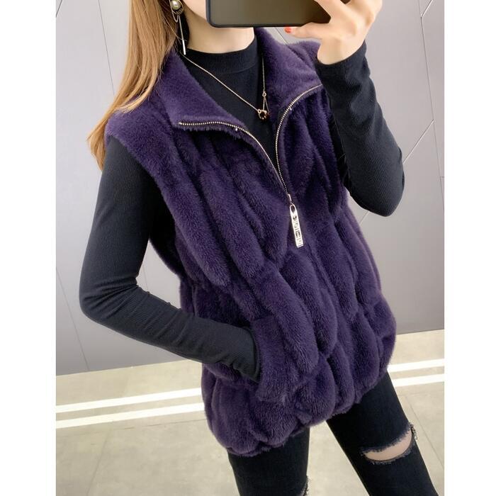 全4色 大きいサイズ シンプル 体型カバー トップス フェイクファー ベスト カーディガン ジャケット 羽織り レディース エレガント 大人 可愛い きれいめ カジュアル フェミニン ノースリーブ ハイネック レイヤード パープル レッド 赤 ベージュ ブラウン 春 秋 冬 20代 30代 40代 50代