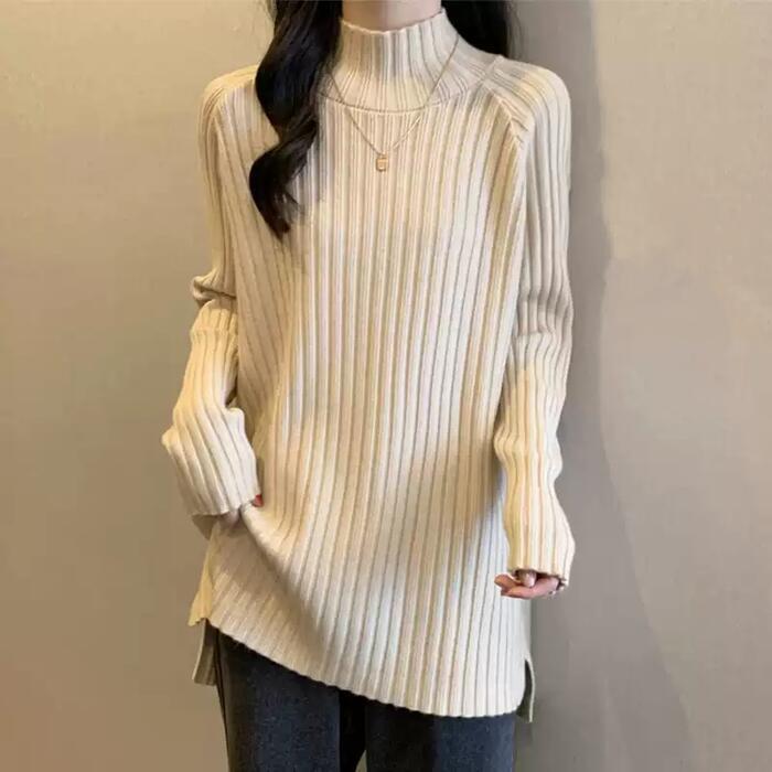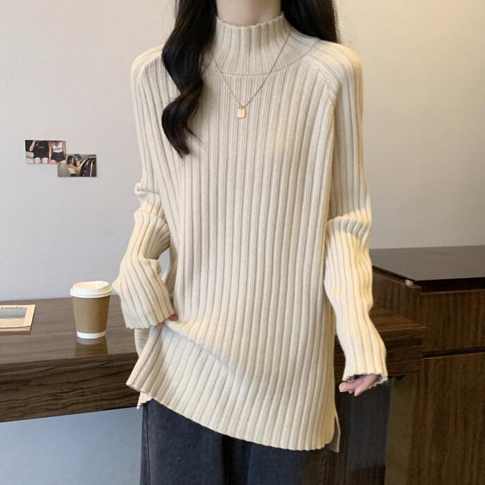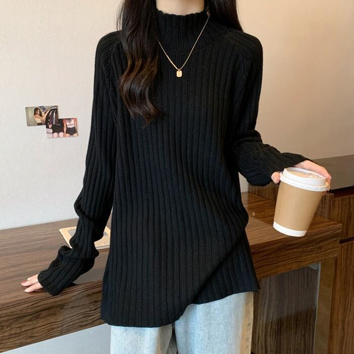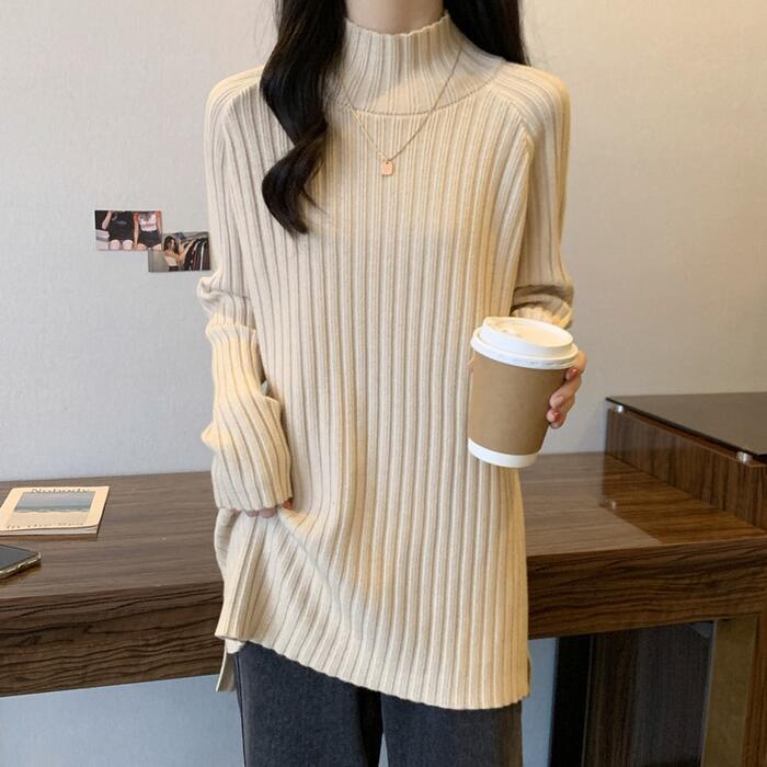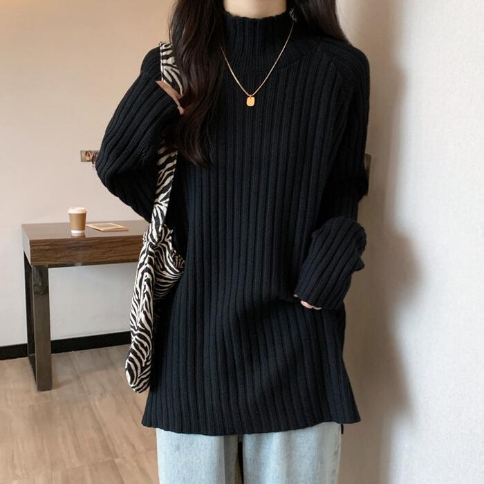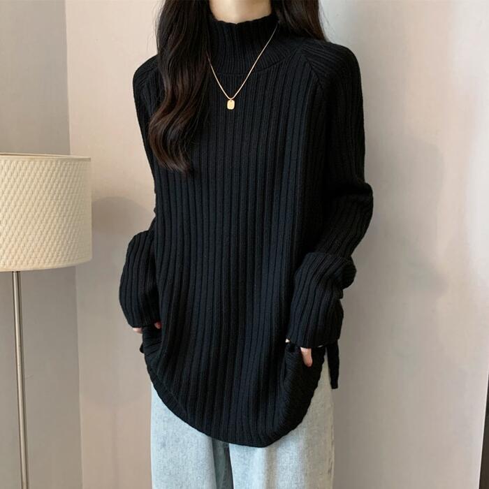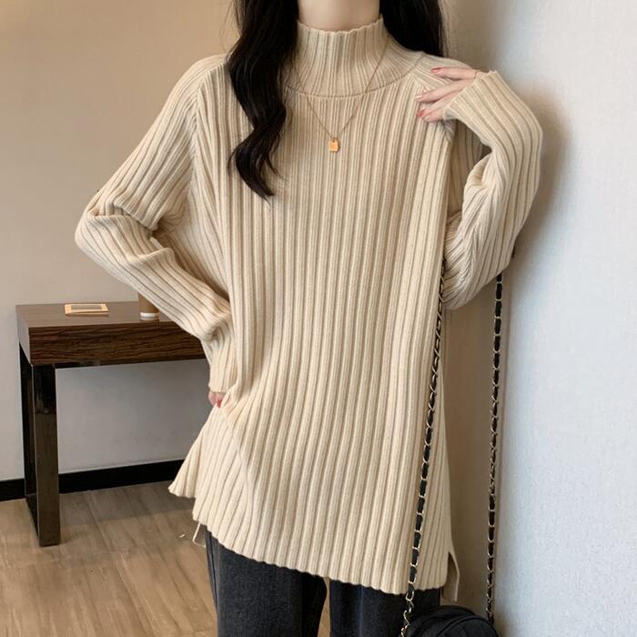 お尻が隠れる丈感のハイネックリブニット。