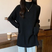 全2色 大きいサイズ ナチュラル プルオーバー トップス リブ ニット セーター カットソー ハイネック タートルネック レディース エレガント 大人 可愛い きれいめ カジュアル フェミニン 長袖 シンプル ベーシック ゆったり 体型カバー ブラック 黒 ベージュ 春 秋 冬 20代 30代 40代 50代