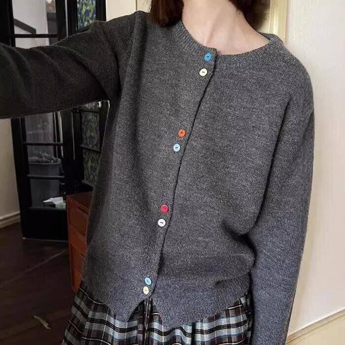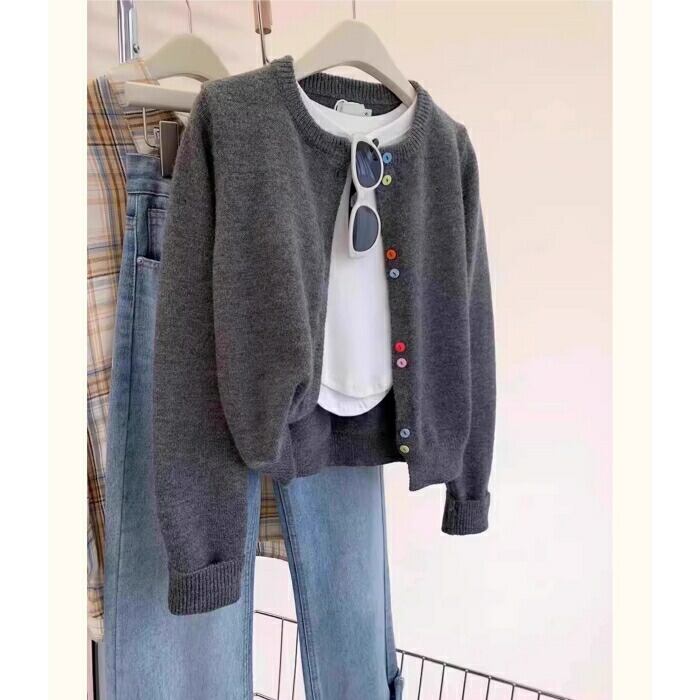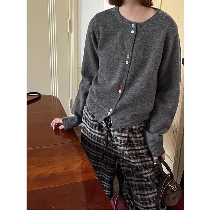 大きいサイズ トップス カーディガン ニット 羽織り ジャケット ボタン レディース エレガント 大人 可愛い きれいめ カジュアル フェミニン 長袖 セーター シンプル ナチュラル クルーネック 体型カバー グレー 春 秋 冬 20代 30代 40代 50代