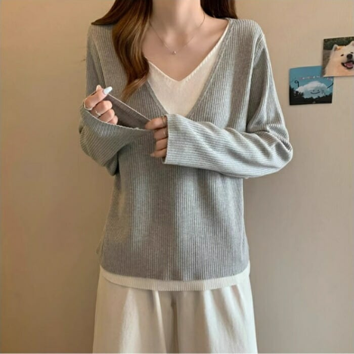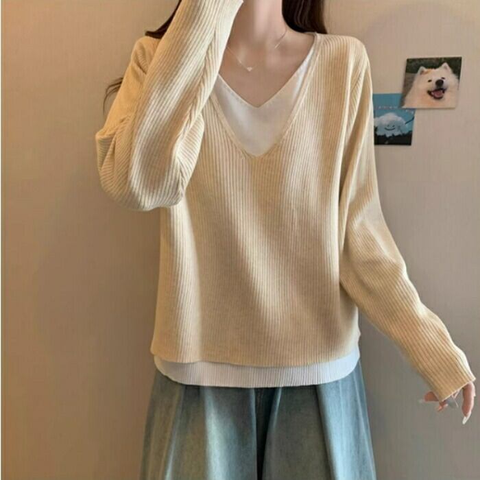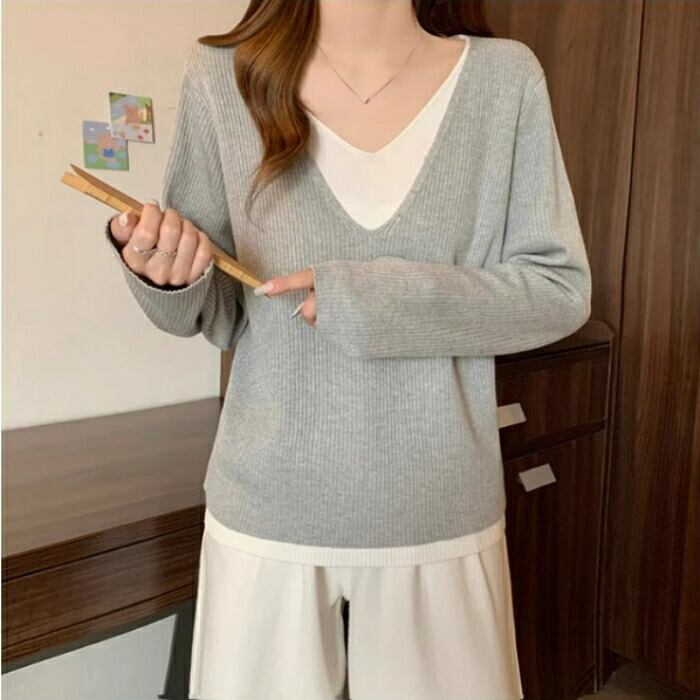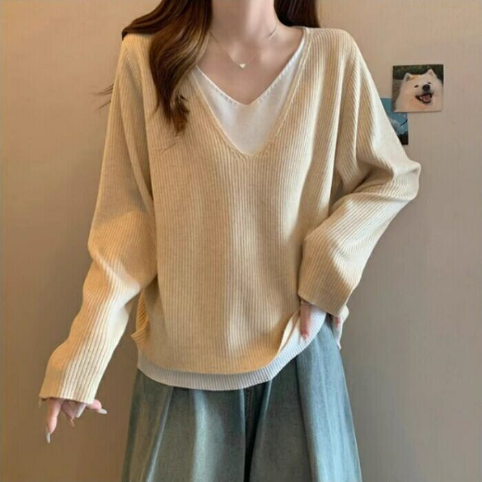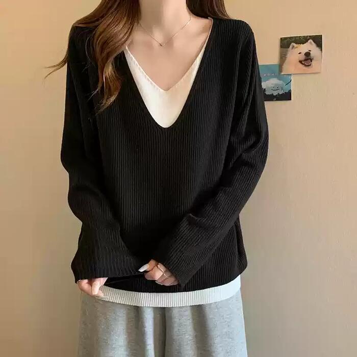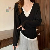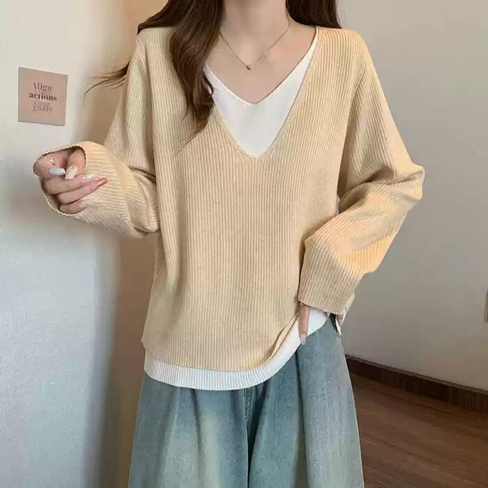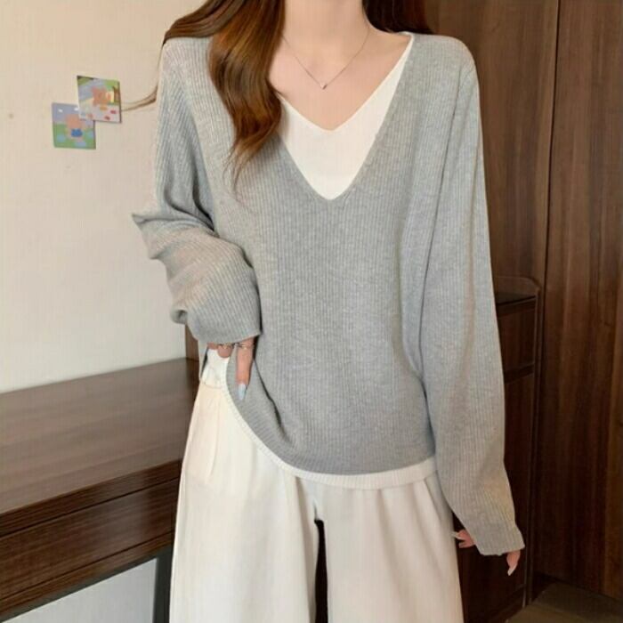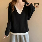 全3色 大きいサイズ 体型カバー レイヤード風 トップス ニット カットソー Tシャツ レディース エレガント 大人 可愛い きれいめ カジュアル フェミニン 長袖 シンプル Vネック ベーシック プルオーバー 無地 グレー ベージュ ブラック 黒 春 秋 冬 20代 30代 40代 50代