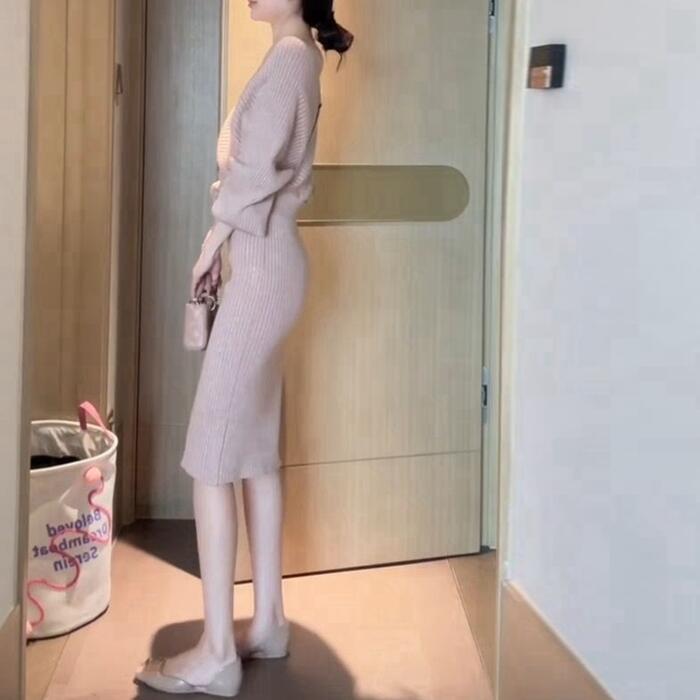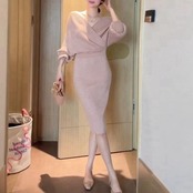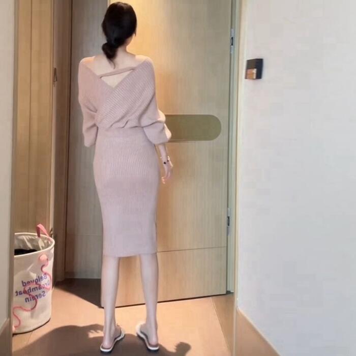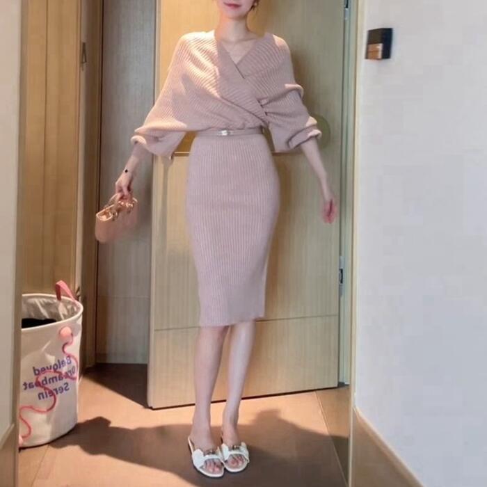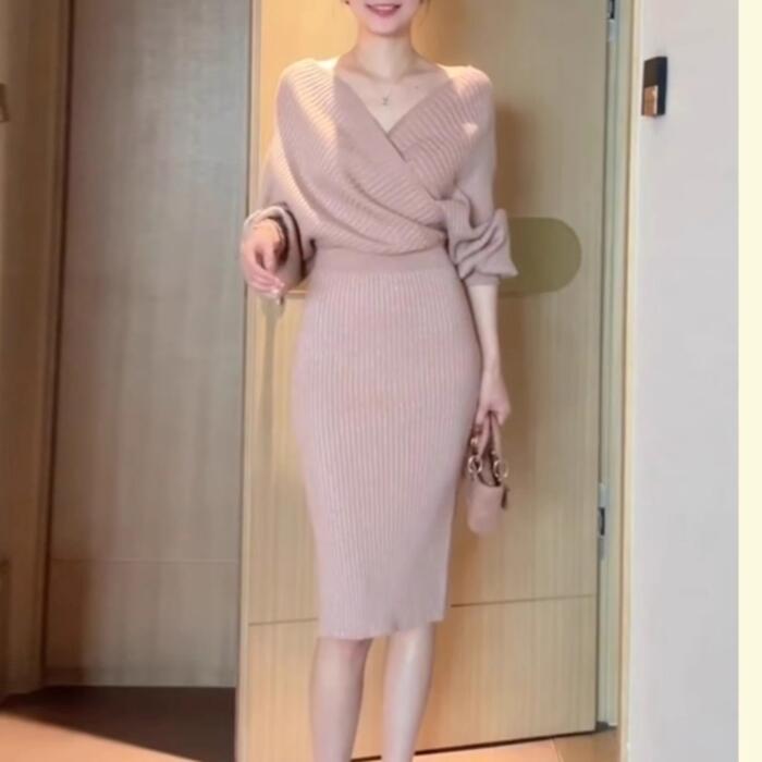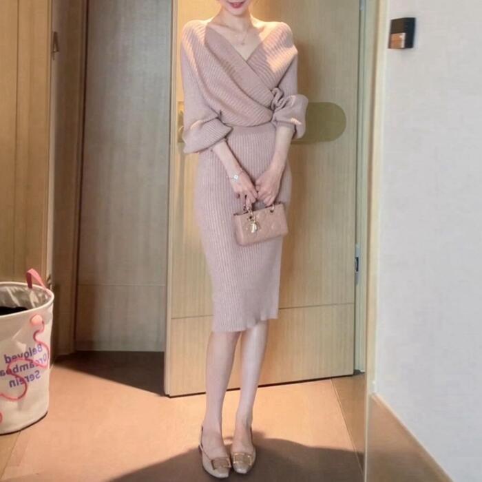 カシュクールデザインが女性らしいニットワンピース。